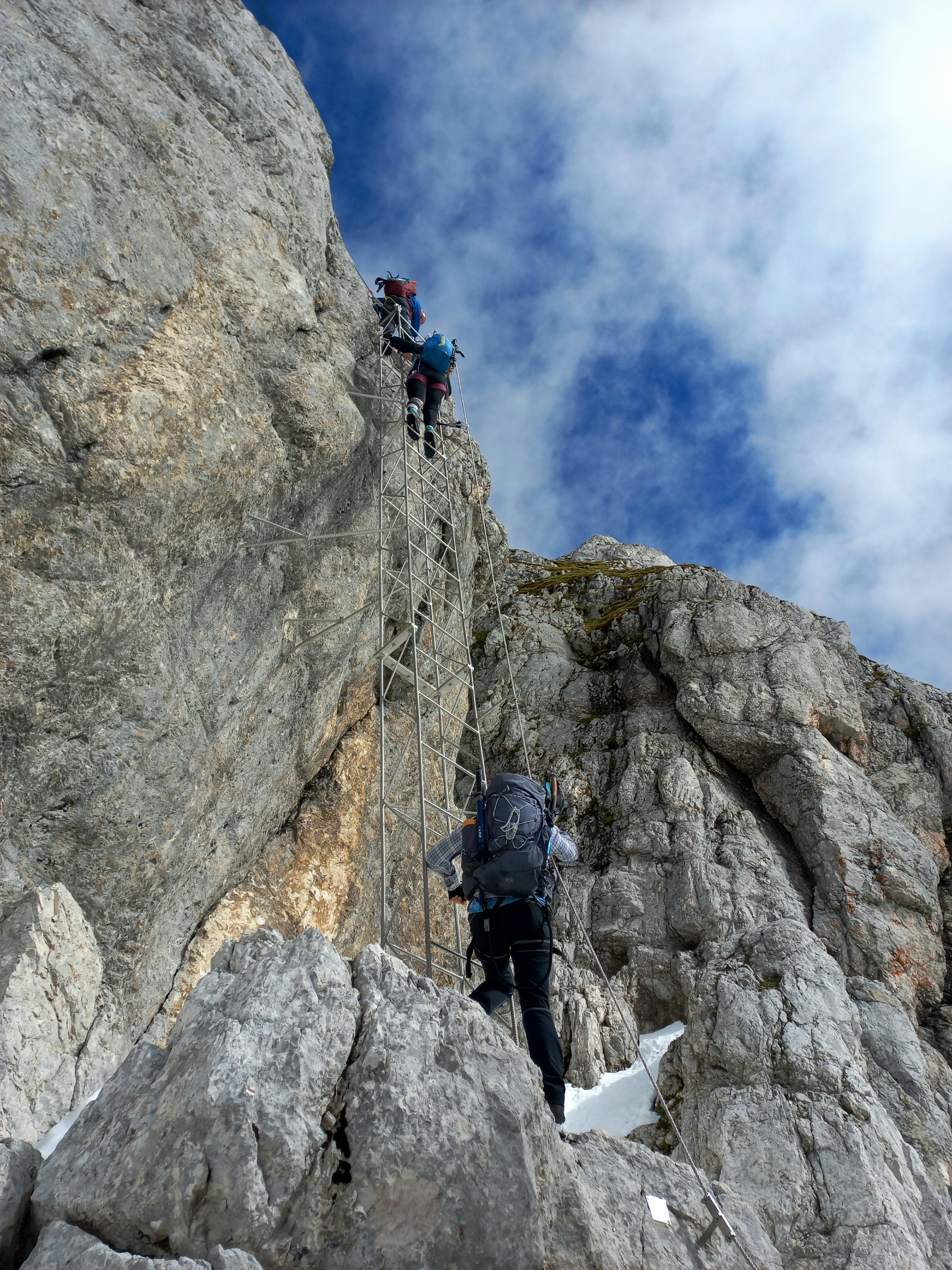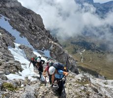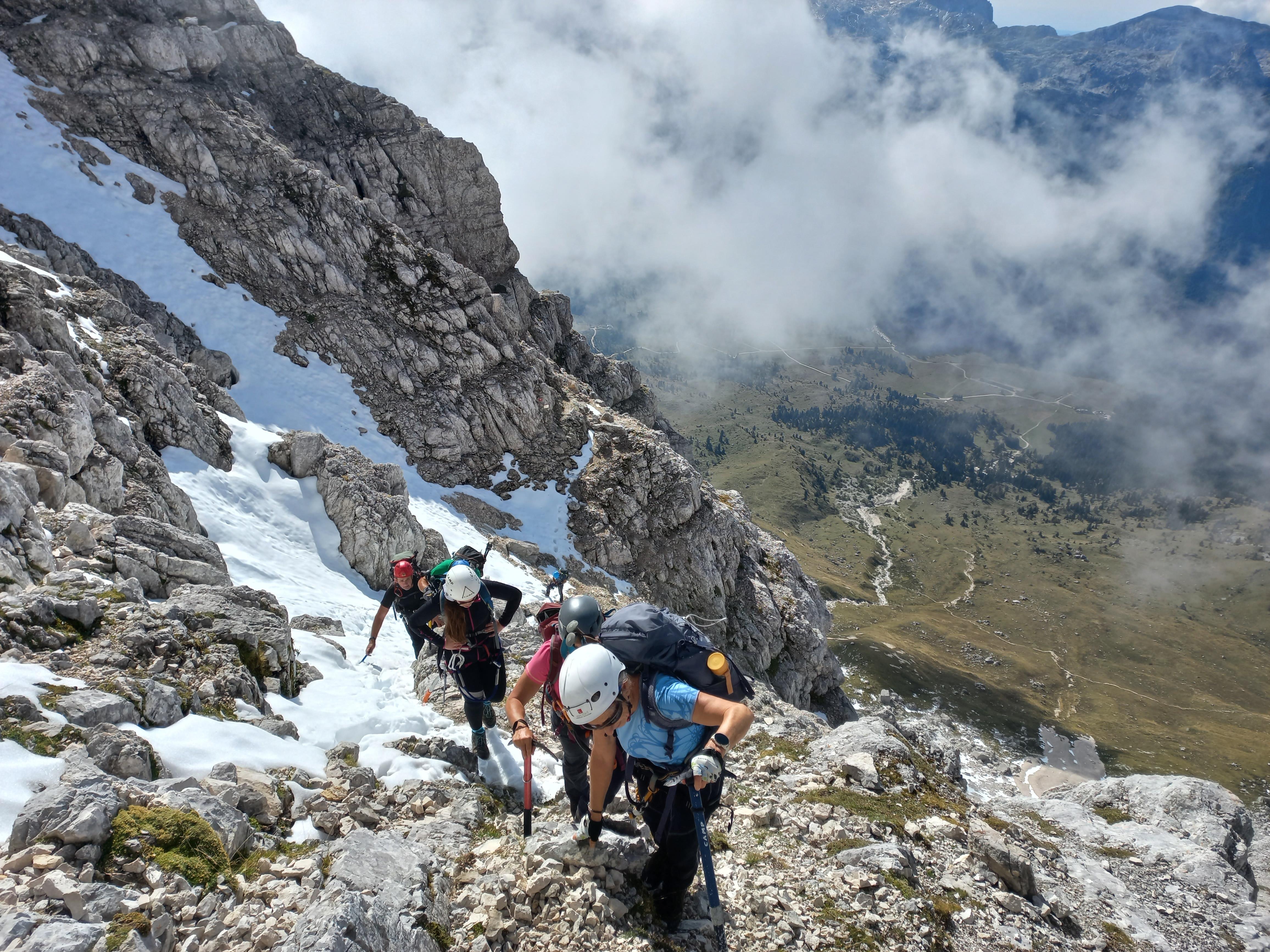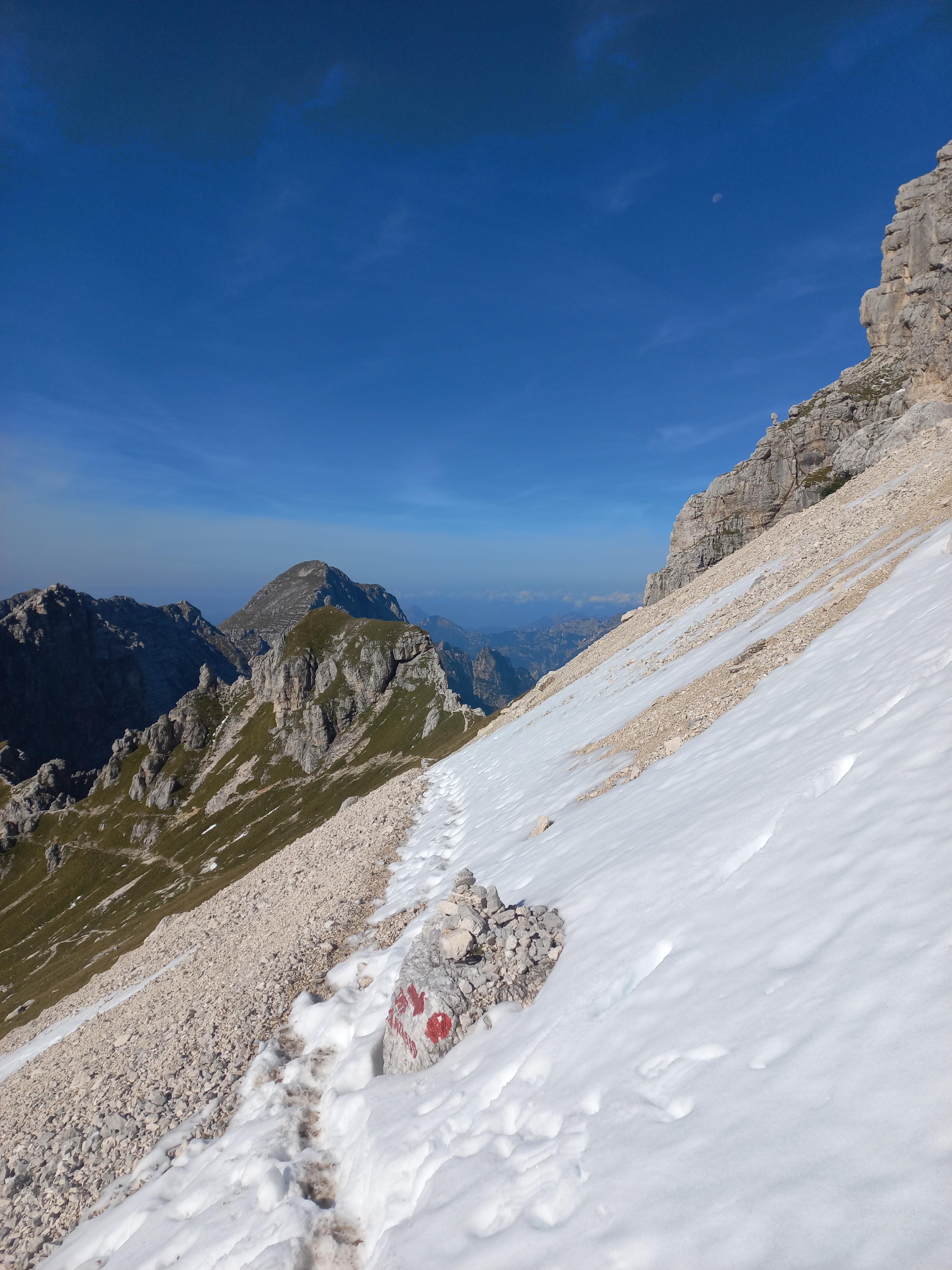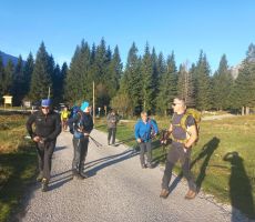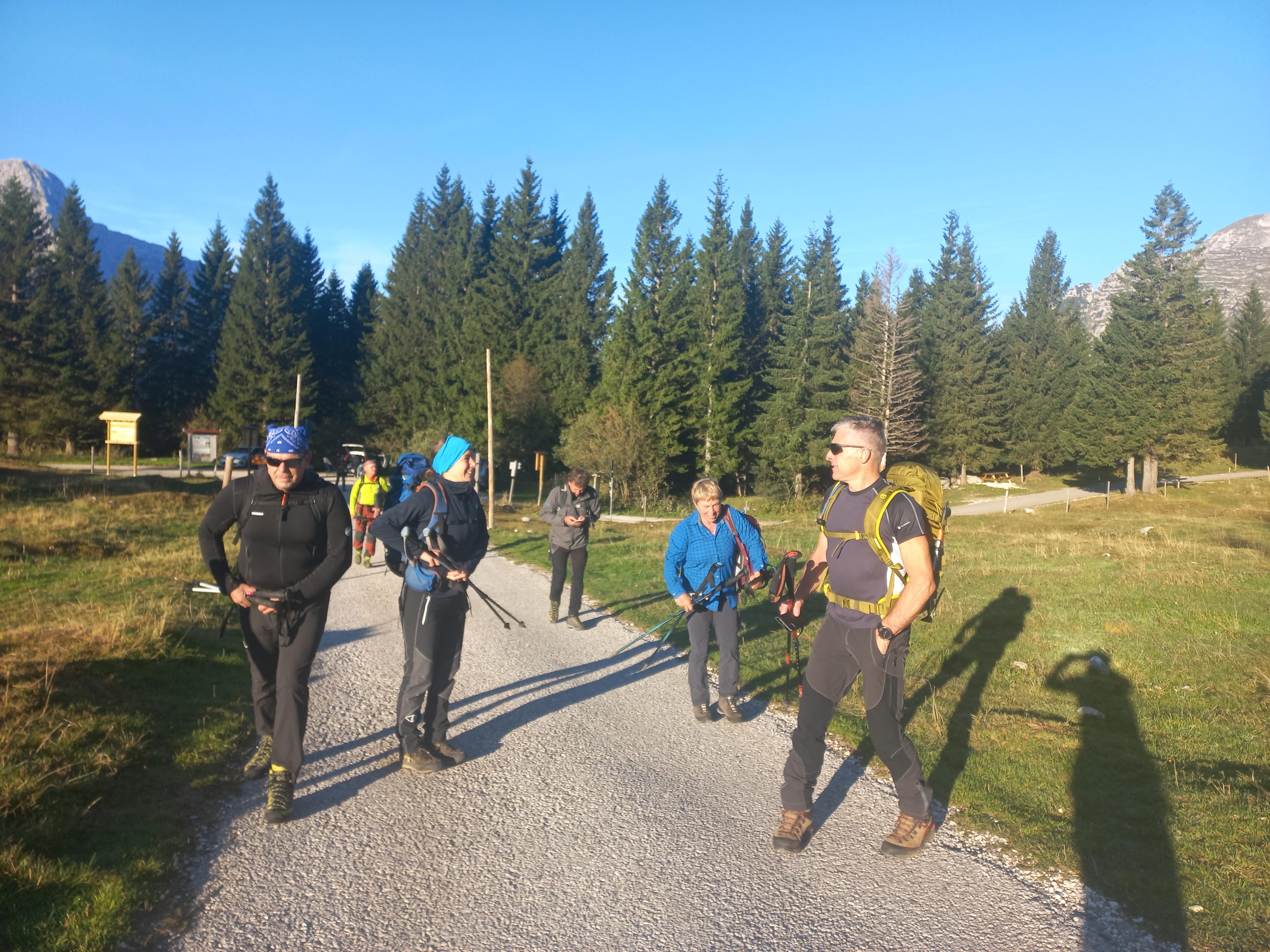 Zjutraj smo se v Solkanu zbrali in preverili kako je z opremo. Nato smo se porazdelili v 3 avte in se odpeljali preko Predela na planino Pecol. Na izhodišču smo se odločili, da se na Montaž povzpnemo po poti Pipanove lestve in po isti poti tudi vrnemo, saj so bile snežne razmere na severni strani, kjer je Findeneggov ozebnik, predvidoma zelo zahtevne. Pot je potekala čez 4 snežišča, kjer smo uporabili cepin, nismo si pa nadeli derez, saj je bil sneg mehak in stopinje že napravljene.