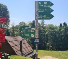 Dan je bil sončen in vroč. Sprehod po gozdu je bil blagodejen. Za kratek čas smo se ustavili pri cerkvi »Majka Božja Sljemenska Kraljica Hrvata« (Majka Božja Sljemenska Kraljica Hrvata - Raspored Svetih Misa). Nekateri so si ogledali notranjost in si vzeli nekaj minut zase. Nato smo pot nadaljevali mimo jase, ki jo domačini imenujejo »Činovnička livada« (Medvednica.info: Činovnička livada). Pohod je gladko potekal skozi prijetno svež gozd in kmalu smo bili na našem cilju, pri planinskem domu Zagreb - Matice ali »Planinarski dom Ivan Pačkovski« (Planinarski dom Ivan Pačkovski - Planinarske kuće - Hrvatski planinarski savez). Tam so že bili zbrani in na nas nestrpno čakali drugi člani in članice društva.