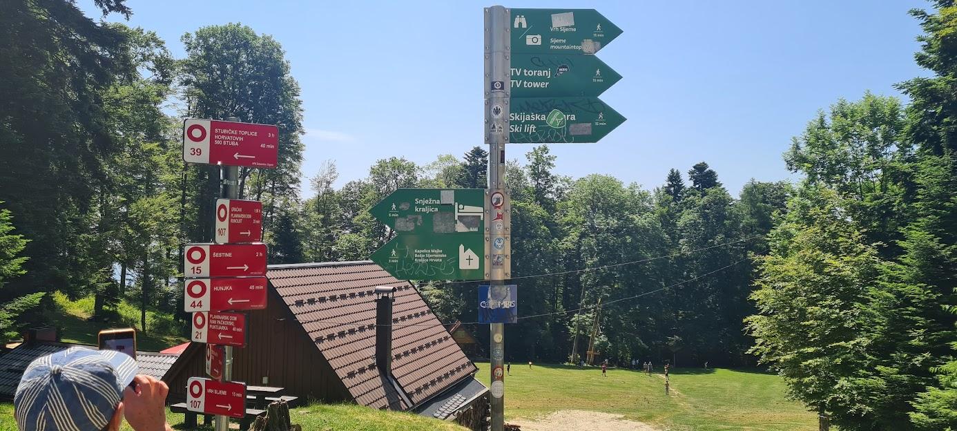 Vožnja do Zagreba je bila dogodivščina z manjšim obvozom, izzivom povezanim s klicanjem prijavljenih, ki se niso pojavili na izhodišču ter pobiranjem po sekundarnih lokacijah po Ljubljani. Postanek za kavo je nam polepšal dan, domačinom pa navijal živce saj so nas nestrpno čakali. No, končno smo prispeli do postajališča vlečnice. Po nakupu vozovnic smo se po skupinah vkrcali v gondole, ki nas je odpeljal na vrh Medvednice. Med vožnjo smo imeli lep pogled na mesto in okolico. Domačinka, ki se je peljala z nami, je pojasnila, da je veliko smoga nad mestom in da življenje zato ni najbolj prijetno. Toda predmestje je lepo in je tam čudovito živeti.