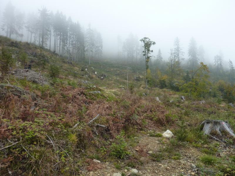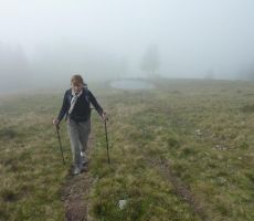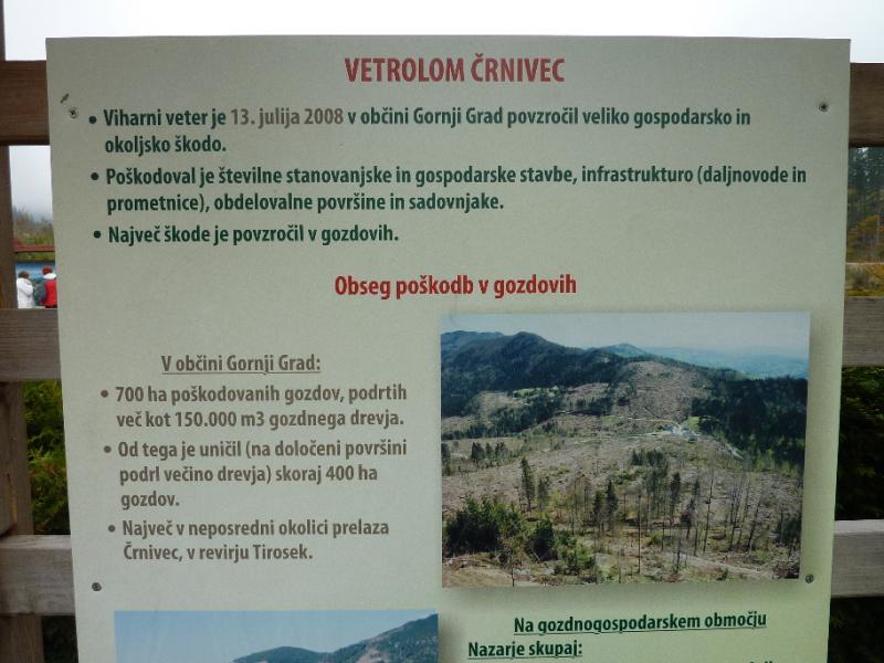 Ustavimo se na prelazu Črnivec, od koder po (od vetroloma opustošenem) gozdu pešačimo proti Kranjski rebri. Vrh, visok 1435 m, dosežemo v uri in pol. V veselje vseh se za trenutek razkadi zoprna megla in pokaže se modro nebo. Požigosamo knjižice, na hitro pomalicamo in se vrnemo do avtobusa. Med potjo spoznavamo in nabiramo različne gobe, poln gozd jih je.