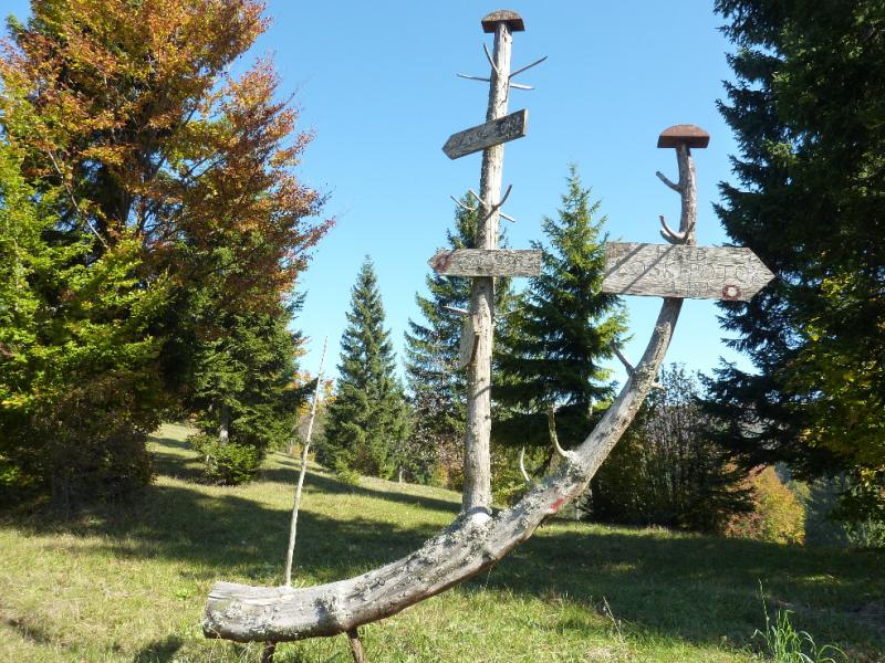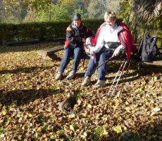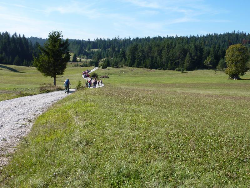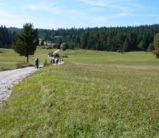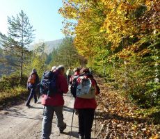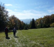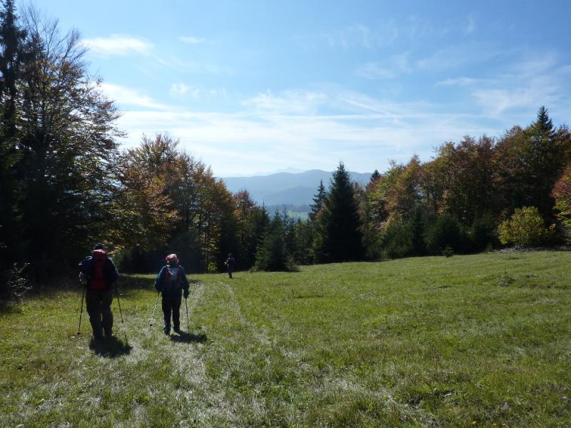 Po ogledu cerkve nadaljujemo pot skozi jesensko obarvan gozd, prek s soncem obsijanih travnikov, proti domu na Travni gori, kjer imamo krajši postanek. Oh, kako prijetno se je greti na soncu, ampak moramo naprej proti Kamen griču. V tamkajšnji planinski koči imamo še en postanek za kavico in čaj, ki nam ju postreže prijazni oskrbnik Milan. Nepričakovano se nam pridružita še naša planinca Bojana in Jože, domačina, ki sta nas gostila pred leti, ko smo že hodili po Ribniški planinski poti. Pot nadaljujemo proti Loškemu potoku. Po prihodu avtobusa nas čaka presenečenje - naša Marinka nas pogosti z domačimi jabolki, jabolčnim sokom in pecivom. Hvala Marinki, bilo je res dobro!
