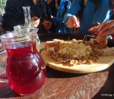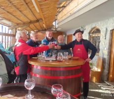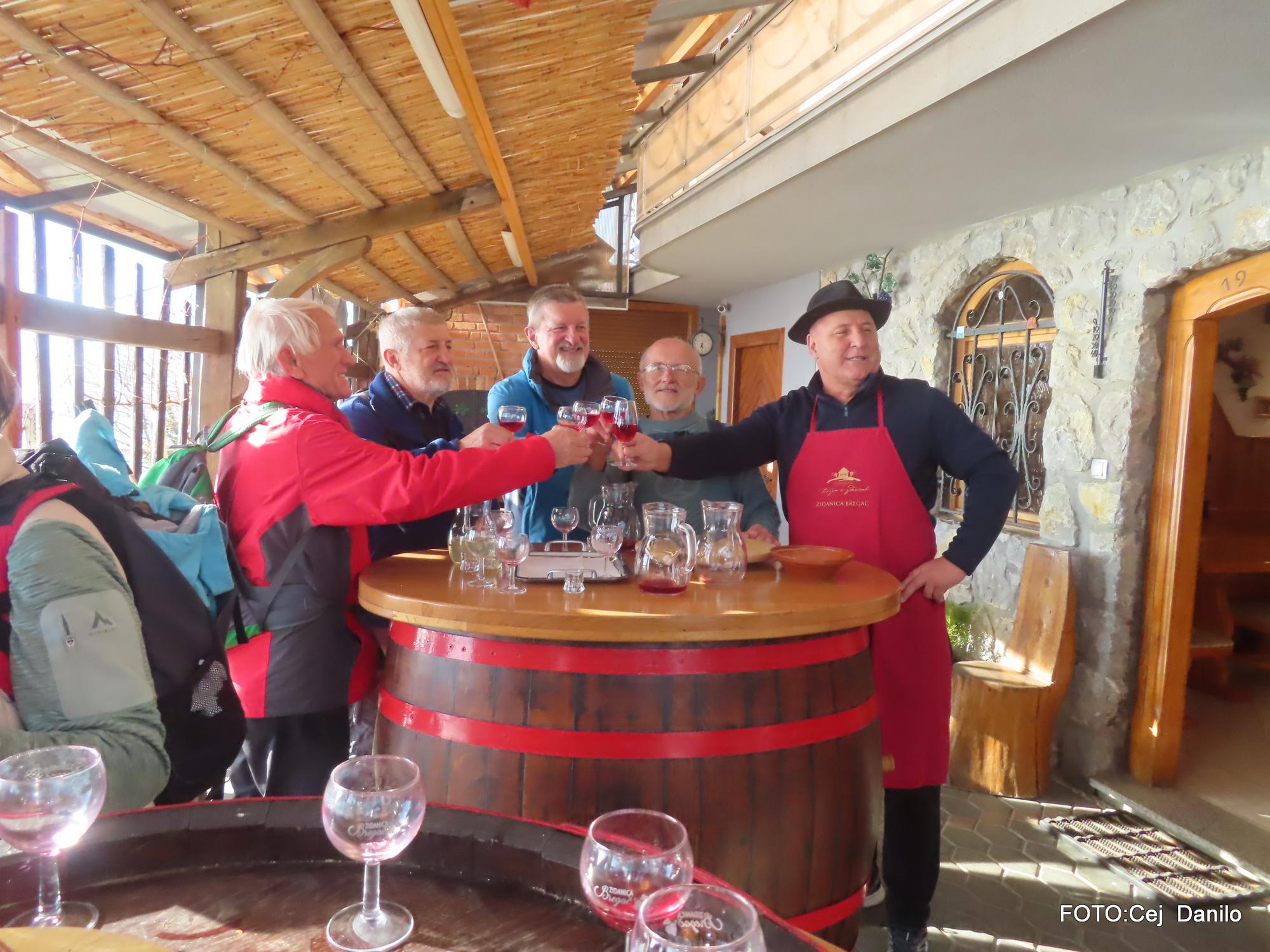 Po počitku smo pot nadaljevali po vinorodnem vrhu, ki je posejan z vinogradi, zidanicami in domačijami. Med potjo smo se ustavili v zidanici Bregač, kjer nas je lastnik veselo pričakal in spregovoril nekaj besed o zidanici. Postregel je s prigrizki in domačo kapljico.