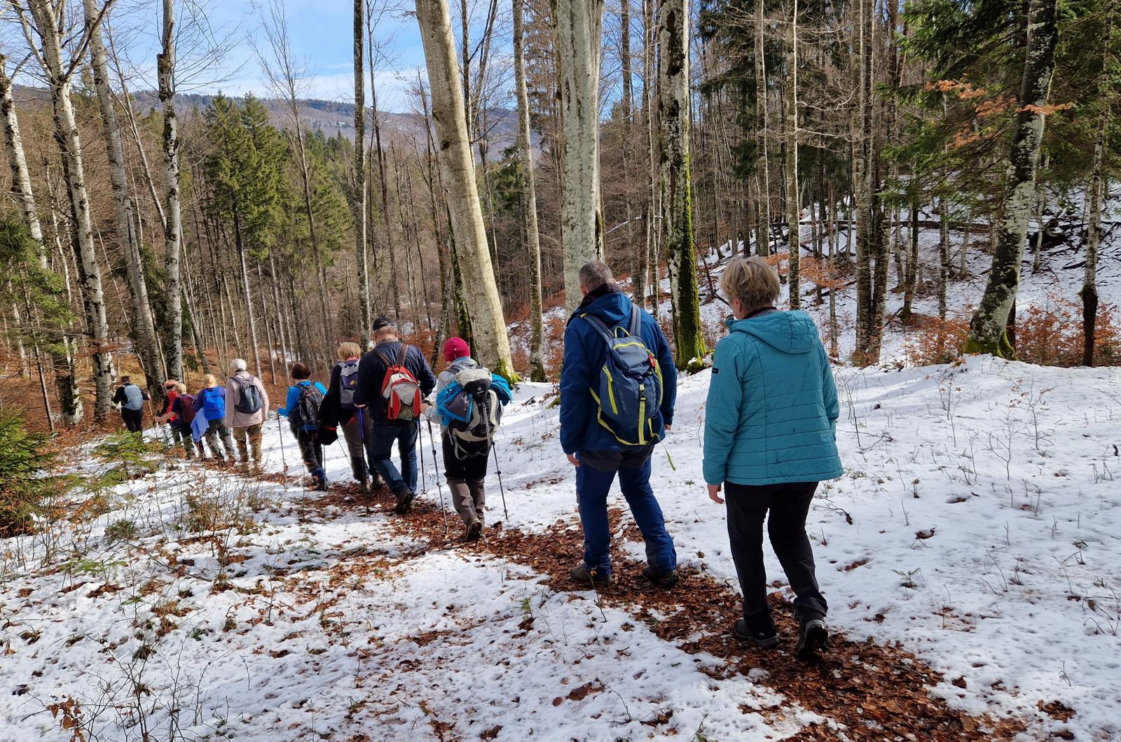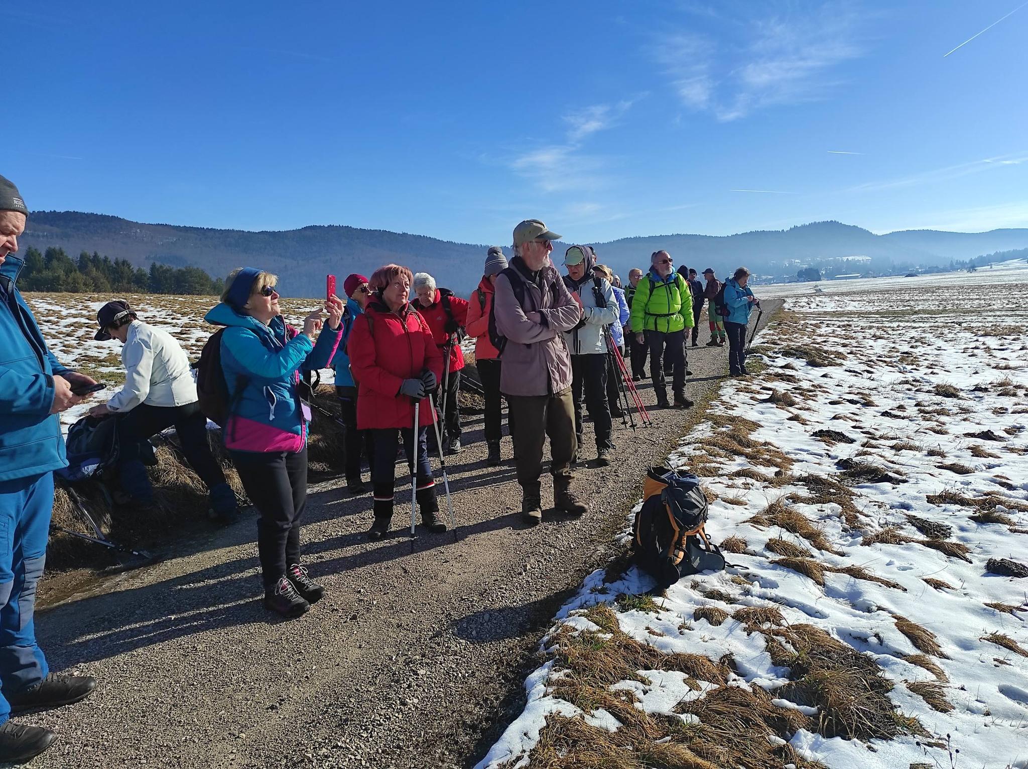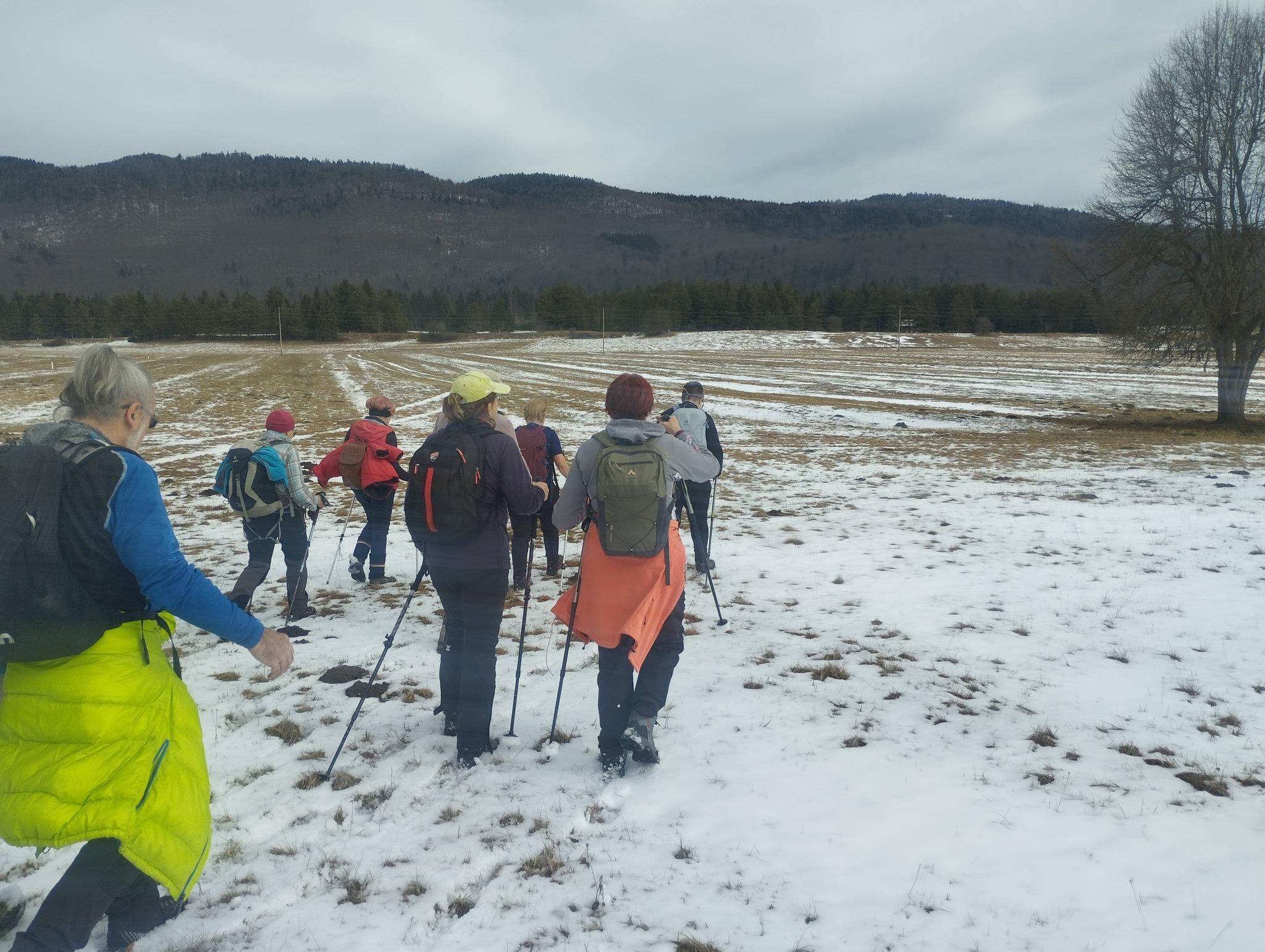 Ustavili smo se pri Rihtarjevi domačiji, kjer nas je pričakala Alenka Veber Rihtarjeva, ki nam je dobrodošlico izkazala s čajem in kavo in nas v nadaljevanju popeljala po stezah Babnega Polja. Kaj kmalu se je izza gozda pokazal Snežnik s svojo snežno kapo. Pot nas je nadalje vodila po gozdnih stezicah vse do razgledišča s kočo in imenom Ušivka. Tu se nam je pogled široko razprl na Babno Polje in tudi pogled na Snežnik je bil intenzivnešji. Naredili smo krajši postanek za malico in ogled razgledov, ter se v nadaljevanju ponovno spustili na polja.
