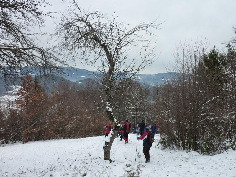 Vreme se je sicer nekaj kujalo, sneg je že pobelil našo deželico in tako je bil to naš prvi snežni pohod. Z avtobusom smo se po štajerski avtocesti zapeljali do Vranskega, kjer se nam je pridružil vodnik Boštjan Semprimožnik, ki je doma iz teh krajev in jih zato zelo dobro pozna. Po krajšem postanku smo se odpeljali proti kraju z imenom Lopata, kjer smo začeli z našim pohodom. Najprej smo se povzpeli do Planinskega doma na Gori (569 m), po domače Šentjungert, ki ga upravlja PD Galicija. Na hribu stoji stara božjepotna cerkev svete Kunigunde, zavetnice otrok in nosečnic. Mežnarija poleg nje pa je obnovljena in spremenjena v planinski dom. Kljub slabi vidljivosti smo vseeno spoznali nekaj okoliških hribov. Malo smo se okrepčali in nadaljevali pot po snegu in tudi malo po asfaltu do vasi Pepelno, kjer nas je čakal avtobus, ki nam je prihranil nekaj kilometrov hoje po asfaltu. Odpeljali smo se do Velike Pirešice in nadaljevali pot peš čez polja, mimo kapelice in grobnice smo prišli na južni del krajinskega parka Ponikvanski kras, kjer stoji cerkev svete Jedrti (363 m), ki je dobila ime po opatinji sv. Jedrti Nivelski. Na vzhodni strani cerkve je grobnica avstrijskega ministrskega predsednika von Becka.