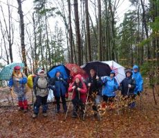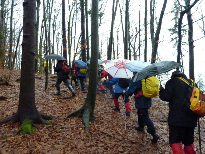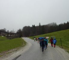 S posebnim avtobusom smo se odpeljali v Srednje Gameljne in se s parkirišča LPP odpravili po Poti kurirjev in vezistov NOV proti vasi Rašica. Le nekaj korakov pred prijazno domačijo »Pr Špan« , ki je ob četrtkih sicer zaprta, se je sprva prijazno, še kar toplo vreme, sprevrglo v neurje in močno deževje. Zato nam je prav prišel krajši postanek v tej domačiji, za jutranje okrepčilo in priprave za nadaljevanje poti v takih razmerah.