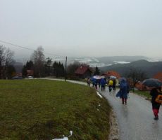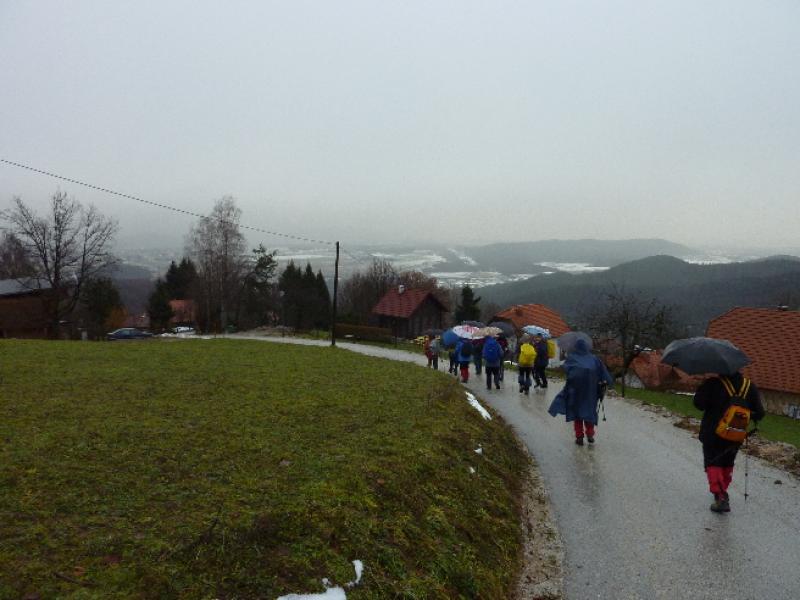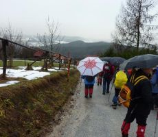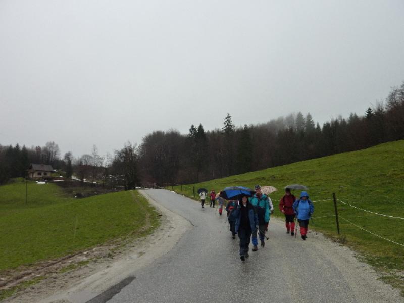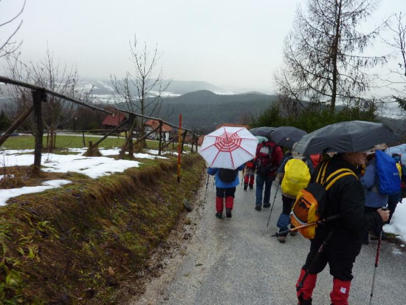 Na poti do Planinskega doma Rašiške čete na Rašici /631 m/ ni bilo težav, v tej prijazni planinski postojanki PD Rašica je bilo prijetno otresti mokroto z obleke in se ogreti ob krušni peči, v pogovoru s prijazno oskrbnico. Nadaljevanje hoje po razmočenem, blatnem terenu do razgledne vasi Dobeno je potekalo že v snežnih razmerah. Vremenske tegobe nam je olajšal daljši postanek v turistični postojanki »Pr Blaž«, kjer smo se okrepčali z dobrim kosilom in se temeljito ogreli ter posušili pred spustom v dolino.