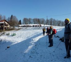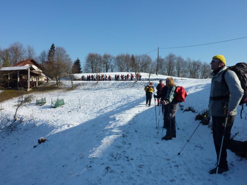 Iz Litije nadaljujemo vožnjo do vasice Zagorica, kjer izstopimo. Tu nas čakata Milena in Tone, ki bosta pomagala Borisu pri vodenju današnjega izleta. Skupaj se začnemo strmo vzpenjati po bukovem gozdu. Snega je ravno za »vzorec«. Na obronkih gozda pa se nam ponuja lep razgled po Jablaniški dolini in na zasnežene vršace v daljavi. V vasi Tisje imamo krajši počitek. Posedemo ob hiši, sonce nas prijetno greje. Tu je tudi zaključek vsakoletnega »Zimskega pohoda na Tisje«, ki ga organizira Planinsko društvo Litija, v počastitev obletnice bitke II. štajerskega bataljona, 24.12.1941. Odpravimo se naprej, saj je kljub soncu hladno in še kar nekaj poti je pred nami. Hodimo po makadamu, kolovozu in gozdu pa smo že na Javorskem Pilu, na glavni cesti, ki povezuje Zasavje z osrednjo Dolenjsko. Prezgodaj! Avtobusa še ni, kuhar pa tudi še ni skuhal kosila. Vodilni so staknili glave in odločili, da izlet še malo podaljšajo. Bili smo veseli saj bi se bilo škoda, v tako lepem dnevu, prezgodaj vrniti domov. Z avtobusom se zapeljemo do Velike Preske, od tu pa peš do Polšnika. Spet se nam ponujajo lepi razgledi. Čaka nas avtobus s katerim se zapeljemo v Litijo, do gostilne Kovač, na kosilo. Ob prijetnem kramljanju čas hitro beži, poslovimo se od Toneta in Milene - hvala in nasvidenje naslednjič!