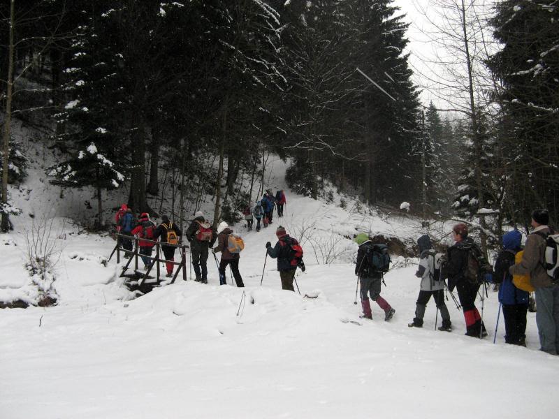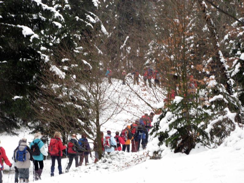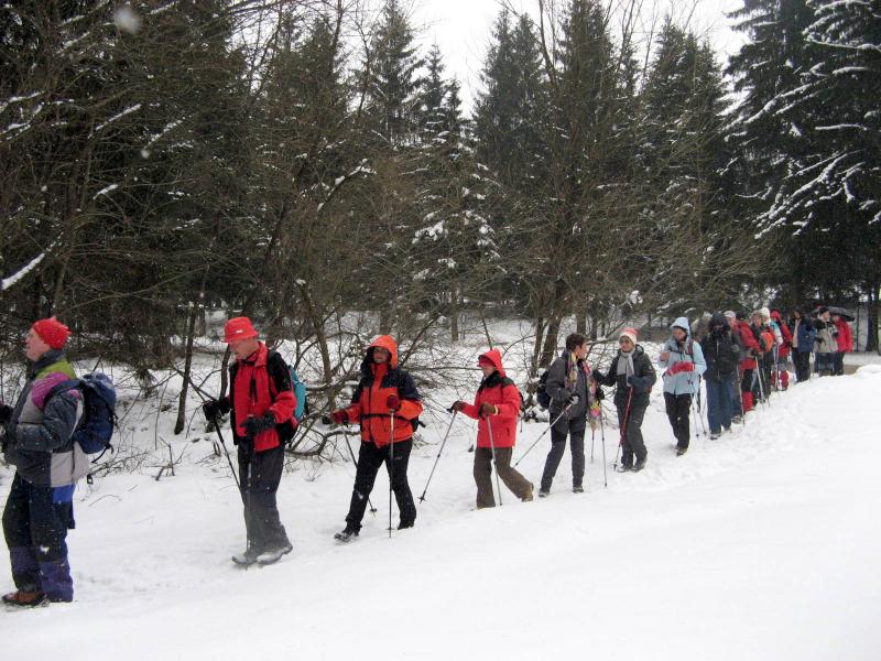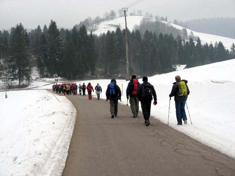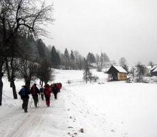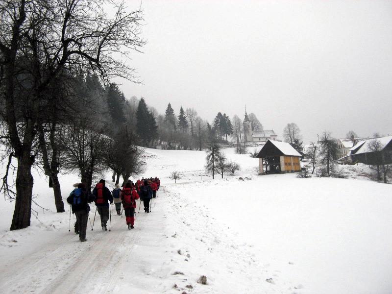 Nadaljevanje pohodniške snežne pravljice iz preteklega leta, ko smo članice in člani PD Pošte in Telekoma Ljubljana pričeli hojo po Logaški planinski poti. Napoved vremenarjev o čudovitem sončnem dnevu je skoraj pokvarila razpoloženje pohodnikom po krajih, ki so jim še do nedavnega pravili, da so »Bogu za hrbtom« zaradi svoje prometne odmaknjenosti. Učiteljica, ki je prišla pred mnogimi leti učit v te kraje, je ob prihodu bridko zajokala, misleč, da je prišla na konec sveta. Megleno in mrzlo nedeljsko jutro je sprejelo v svoje nedrje 57 pogumnih pohodnikov, ki so se odločno, polni novih pričakovanj in izzivov spet podali v to manj znano, čeprav od prestolnice ne tako oddaljeno pokrajino. Medtem, ko je večina državljanov še spala, so v Rovtah bili že pri sveti maši in s svojimi vozili zasedli edini večji parkirni prostor v kraju. Rovte sestavljajo naselja Rovte, Petkovec, Praprotno Brdo in številni mali zaselki, ki ležijo na 700 metrih nadmorske višine. Tu je naravno križišče poti proti Vrhniki, Idriji, Logatcu in Žirem. Danes so to lepo urejene hribovske vasice, kjer poleg vse bolj razvijajočega turizma oživljajo tudi stare obrti: klekljanje čipk, pletenje košar, izdelovanje raznih izdelkov iz lesa. Razgiban teren, bogate naravne danosti in bližina mest je pritegnila tudi izletnike. Prek travnikov, gozdov in skozi vasice potekajo številne poti: Evropska pešpot E7, Notranjska, Logaška, Škofjeloška, Mladinska planinska pot ter Logaška kolesarska pot. Zaradi odprtosti terena je tu potekala cesta že v davni preteklosti, saj so vozarji vozili tod mimo iz Trsta v notranjo Avstrijo. V vasici Smrečje, kjer danes stoji cerkev, je nekoč stala kapela z Marijino podobo, ob kateri so se vozarji ustavljali in priporočali za srečno pot.