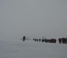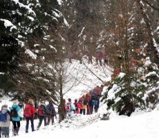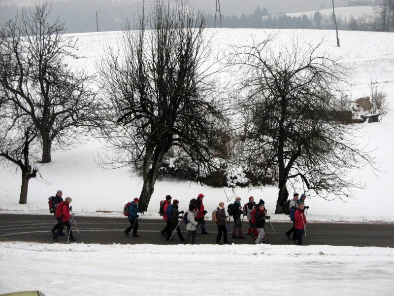 Današnja cerkev Marijinega vnebovzetja je morebiti celo iz 16. stoletja in sodi med priljubljene božje poti, vse do današnjih dni. Na Kranjskem je bila v17. in 18. stoletju posebno sloveča božja pot k Svetim trem Kraljem na Vrhu pri Rovtah med Logatcem in Žirmi. Cerkev Sv. Treh Kraljev, ki so tudi zavetniki popotnikov, je bila omenjena že leta 1560 in romarji, ki so prihajali k Mariji v Smrečju ali k Trem Kraljem, so obiskali obe. Vrh je raztresena hribovska vas, na 884 m visokem vrhu samevata cerkev in župnišče. Pogled na okoliške hribe, travnike, njive, bujne gozdove, pomirja obiskovalce, tako romarje kot tudi vedno več pohodnikov. Lepota idilične pokrajine, raztresenih vasic s cerkvicami na hribčkih, starimi tipičnimi velikimi hišami, v zimsko tančico odeta pokrajina, ki kot Trnuljčica spi v svojem idiličnem spanju, nas prestavi v nek drug čas, morda tistega iz otroštva, ko smo še verjeli v pravljice in pravljične junake, ki so domovali v prelepi gozdni pokrajini, oblečeni v zimsko čipko nedavno zapadlega snega. K vzdušju doprinese meglenost dneva, popestrena s kratko snežno ploho. Na koncu poti nas spet, tako kot lani, sprejme »dobra vila«, članica našega društva. Na svojem domu nas pogosti s čajem in ponovno se prepričamo v gostoljubnost ljudi tega območja. Verjetno so res delovale »nadnaravne sile«, saj je voznik skupaj z nami varno pripeljal ogromen avtobus po ozki in vijugasti cesti do kmečkega turizma Kisovec. Iz pravljičnega sanjarjenja so nas tu dokončno prebudile domače kulinarične dobrote, preostanek popoldneva smo preživeli v prijetnem druženju in plesu.