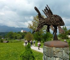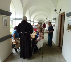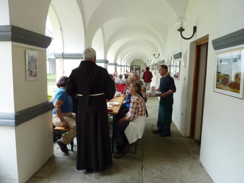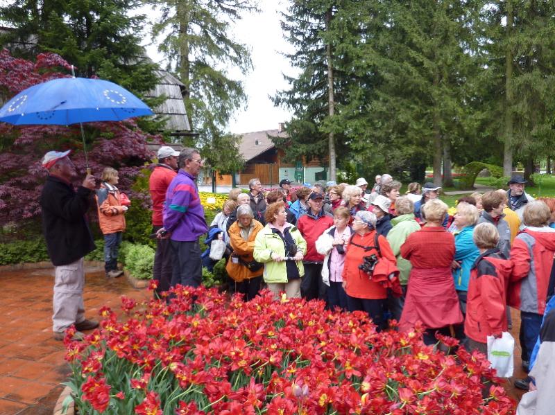 V Nazarjah nas je pot peljala mimo hiše, v kateri je živel in delal znameniti kipar Jože Horvat Jaki, nato pa smo se povzpeli do frančiškanskega samostana. Na samostanskih vratih je napis, da tod mimo vodi Martinova pot, ki povezuje kraje med Sombathelyjem na Madžarskem, kjer se je sv. Martin rodil in Toursom v Franciji, kjer je njegov grob. Lepo smo bili sprejeti, Pater Damjan nas je prijazno povabil v jedilnico, kjer smo se najprej okrepčali z dobro enolončnico, potem pa nas je popeljal še v cerkev Marija Nazaret, po kateri je kraj Nazarje dobil ime. Tam smo izvedeli, kako sta se samostan in cerkev skozi zgodovino gradila, povedal je, da že od leta 1752 deluje samostanska knjižnica in da so frančiškani tu že kakih 350 let. Bogato samostansko knjižnico smo si tudi ogledali. Oblaki so prinesli nekaj dežja in zoprno je zapihalo, zato smo se poslovili od prijaznega gostitelja in se po strmih stopnicah spustili v Nazarje, od koder nas je avtobus zapeljal v Mozirski gaj. Najprej z dežniki, potem pa tudi brez njih, smo si ogledali lepo urejene gredice, na katerih so se razkošno pozibavale glavice tulipanov najrazličnejših barv. Gospod Božo iz Mozirskega gaja, ki deluje kot društvo, nam je med vodstvom skozi park pripovedoval, kako poteka njihovo delo in s kakšnimi težavami so se že spopadali, da je park ostal in postal to, kar je danes. Vse tulipane, narcise, hijacinte, azaleje, mačehe in še mnoge druge rože, ki cvetijo v tem času v Mozirskem gaju, bi težko prešteli. Tega nismo niti poskušali, le uživali smo in v fotoaparatih odnesli del njihove barvitosti in lepote domov.