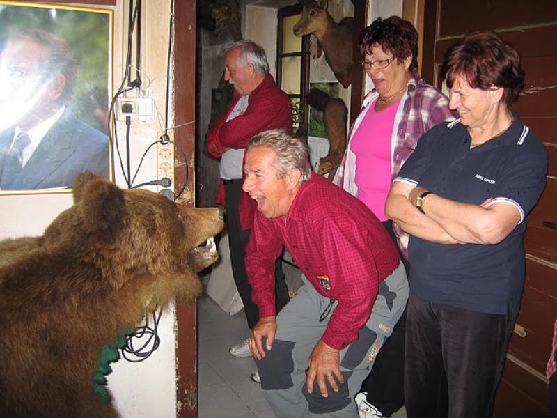 Ko smo prišli do avta in sem se želela s kolesom odpeljati v dolino, ugotovim, da je prednje kolo prazno.Takoj mi priskočijo na pomoč, da se ob poti ustavimo pri prijatelju, ki mi bo posodil pumpo. Imeli smo vztok za še en postanek, saj se nam ni mudilo v dolino. Dež nam je prekrižel načrte in smo si le ogledali nagačene živali, ki se skrivajo v njegovi kamri.
