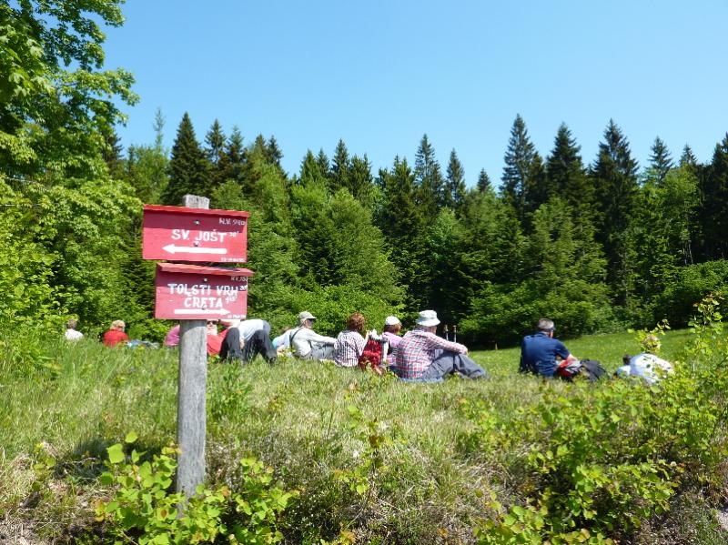 Povzpeli smo se na Tolsti Vrh, ki je najvišja točka Dobroveljske planote in se od tu spustili - mimo cerkvice sv. Katarine, pri kateri stoji spomenik prvi frontalni bitki Štajerskega bataljona leta 1941- do Planinskega doma I. Štajerskega bataljona na Čreti. Malo nad kočo smo si ogledali ličen leseni spomenik neznanemu kurirju.