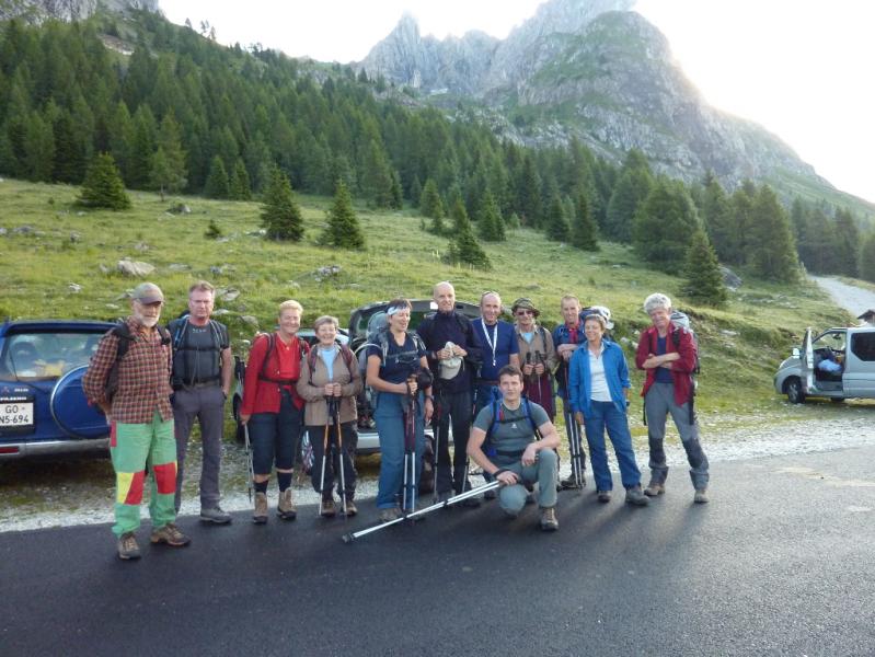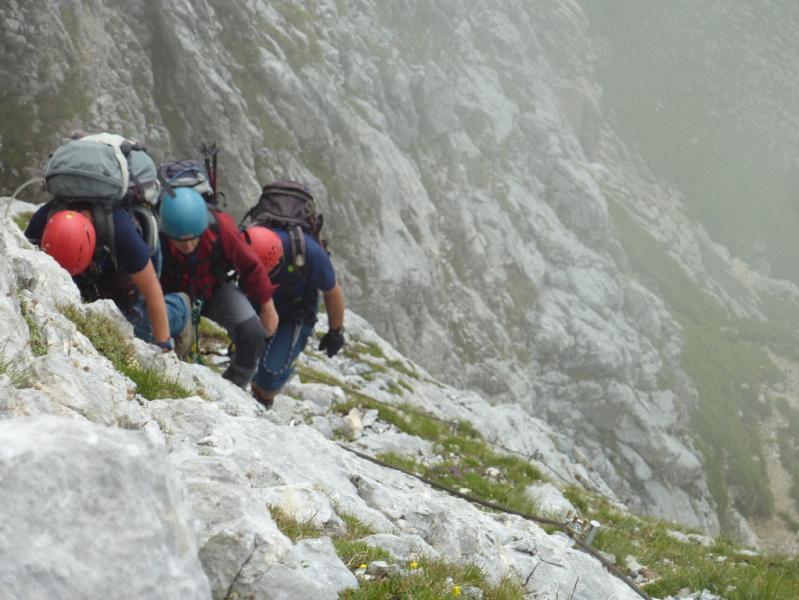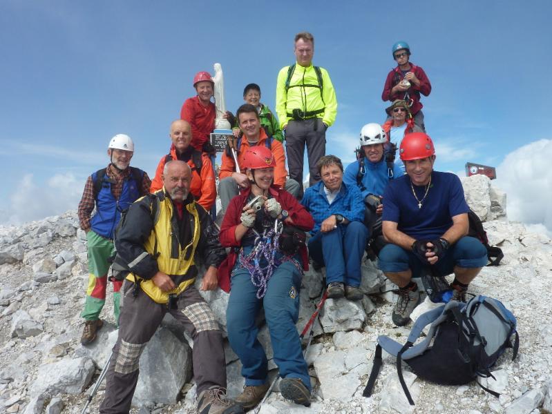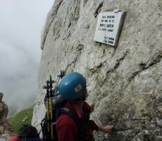 Letos smo vzpon na Monte Peralbo razpisali skupaj z našo Planinsko skupino PT Nova Gorica. In kot zakleto, vremenska napoved že spet ni kazala najbolje. Kljub temu sva se z goriškim vodnikom Ivanom Trampužem odločila, da gremo na pot in bili smo bogato nagrajeni, saj smo poleg Peralbe preplezali še sosednji Chiadenis in tako opravili veličastno celodnevno plezalno turo. Ob 4.30 uri se nas je iz Ljubljane odpeljalo 7, na izhodu avtoceste pri Tolmezzu se nam je pridružilo še 7 planincev iz Nove Gorice in skupaj smo nadaljevali vožnjo do Sappade, od koder smo se po ozki cesti povzpeli k izviru reke Piave, na nadmorski višini 1815 m. Po krajših pripravah opreme in obutve smo se po poti 132 v dobre pol ure povzpeli do Planinske koče Rifugio Calvi (2164 m), popili jutranjo kavo in se razgledali proti zamegljenemu vrhu Peralbe. Kaj kmalu smo se odpravili pod vznožje "Bele skale", nadeli čelade in plezalne pasove ter se začeli vzpenjati po prijetni zavarovani poti "Ferrata Pietro Sartor". Delno oblačno vreme nam je ustrezalo, saj bi nam bilo sicer med plezanjem precej vroče, zato nas je bilo vseh 14 kar hitro na vrhu Peralbe. Krajši postanek na vrhu za malico in fotografiranje je hitro minil. Sestopili smo po lažji "Poti papeža Janeza Pavla II." do prelaza Passo Sesis, od koder je le nekaj korakov do koče Calvi. Zgodnja dopoldanska ura in vse lepše vreme je botrovalo naši odločitvi, da na predlog vodnice Ingrid opravimo še plezalno prečenje sosednje gore Chiadenis. Ostali so se odpravili na uživaško krožno pot okoli gore do izvira reke Piave, 8 pa nas je nadaljevalo pot do prelaza Falso passo dei Cacciatori, kjer je vstop v ferrato. Izkazalo se je, da je plezanje na Chiadenis precej bolj navpično in zahtevno, kot na sosednjo Peralbo. Vendar nam je vzpon na pokončno skalno trdnjavo ponudil veliko plezalnih užitkov, vse do samega vrha, vmes pa smo opazovali polno ostankov vojaških postojank iz I. svetovne vojne.