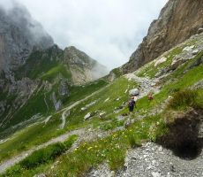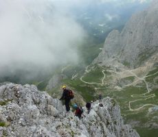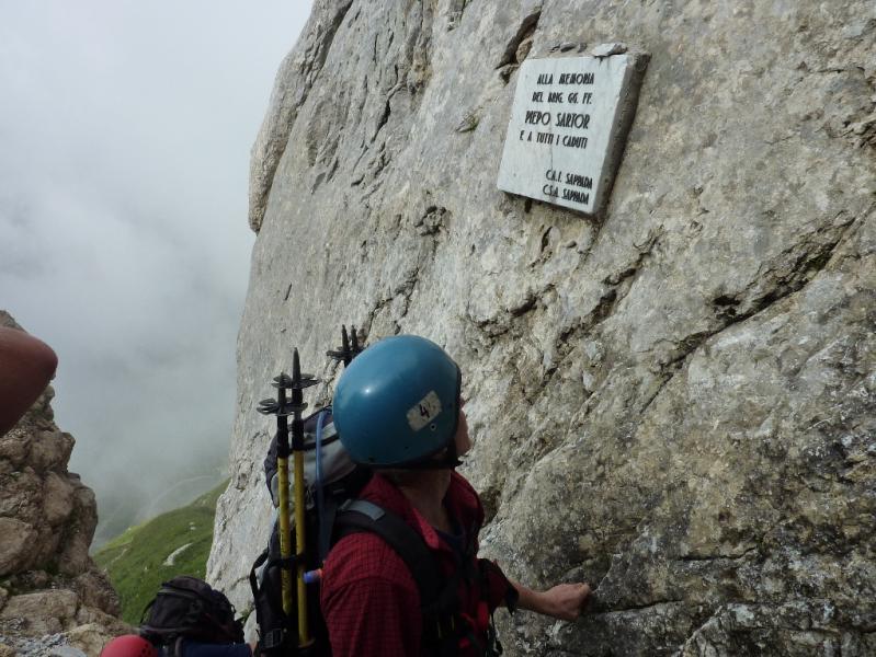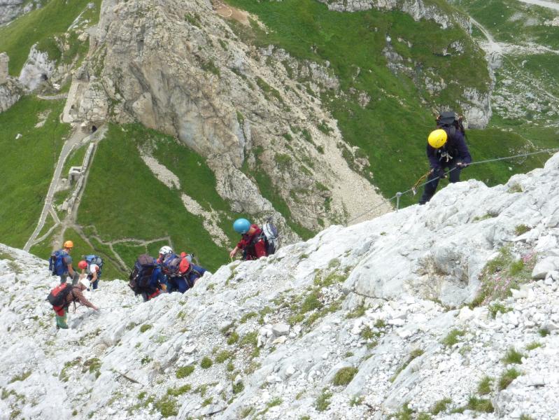 Sestop po smeri vzpona bi bil zagotovo precej zahtevnejši, mi pa smo jo ubrali na jugozahodno stran, kjer je grebenska pot vseskozi zavarovana z jeklenico, čez gladke in mestoma mokre plošče pa so nam bile v pomoč tudi verige. Kmalu smo bili pri vojaških ostankih nad kočo Calvi, mimo katere smo se po cesti spustili na parkirišče, od tod pa 500 m naprej do izvira Piave, kjer so nas pričakali ostali. Čudovita celodnevna plezalna tura se je končala z nazdravljanjem našemu Ivanu, ki je praznoval rojstni dan. Ostala je še triurna vožnja v Ljubljano, kjer smo se razšli z željo, da bi kmalu opravili kakšno podobno turo - morda kar na sosednji masiv Monte Avanza (2489 m).