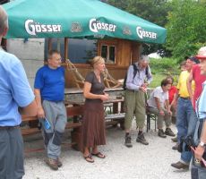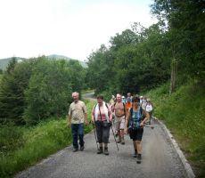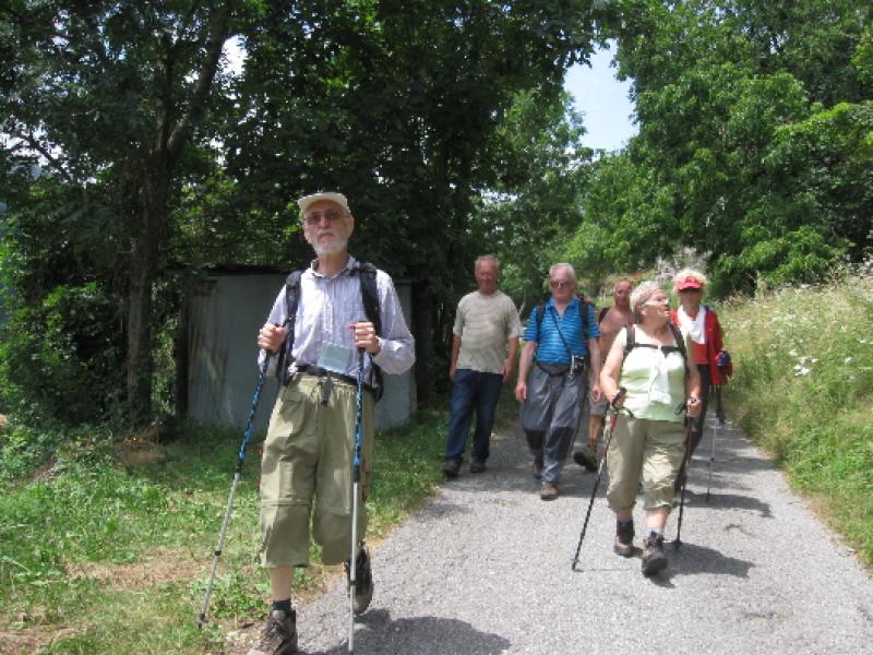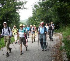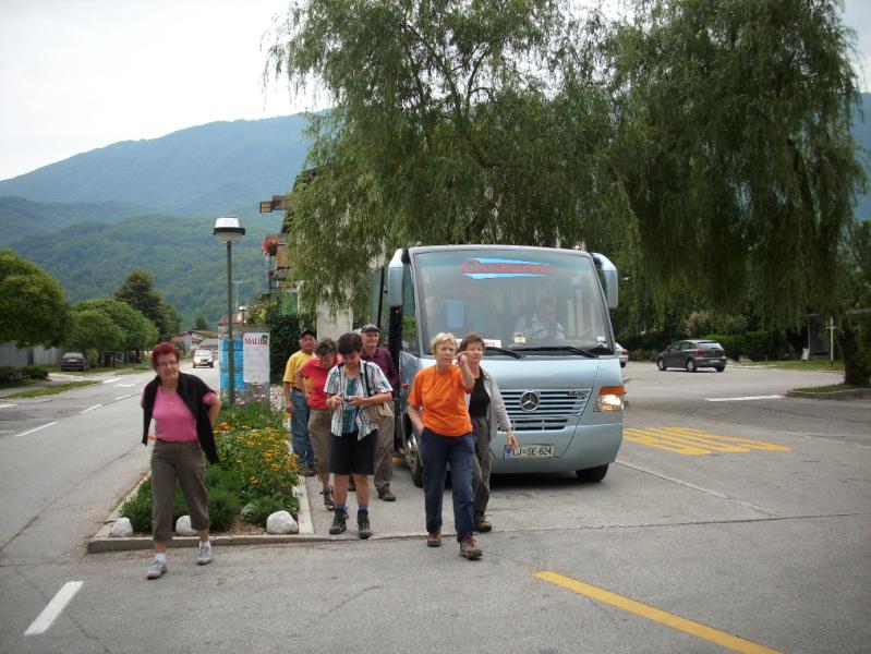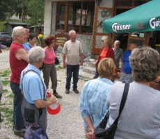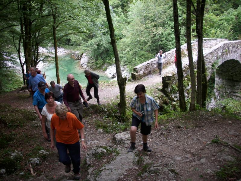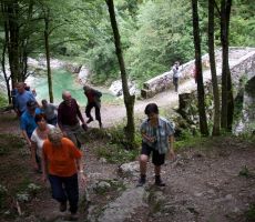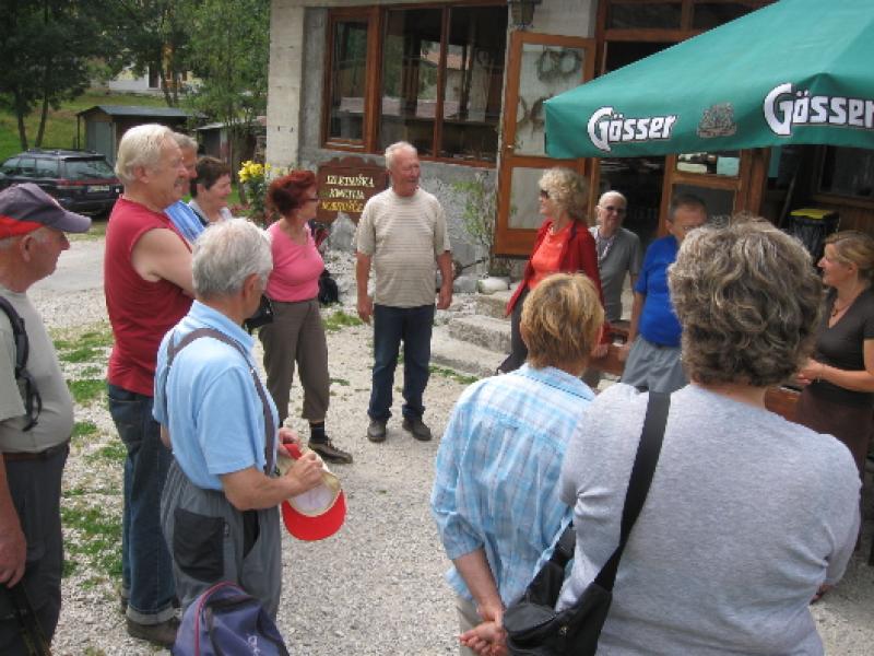 Nekoliko prej kakor običajno, nas je midi-bus popeljal iz Ljubljane proti Robidišču, najzahodnejšemu zaselku v Sloveniji. Velik del poti smo se vozili ob reki Soči, tako da smo lahko opazovali njene bregove in čudovito turkizno, modro-zeleno barvo. Kratek postanek smo naredili v Kobaridu. Naprej do Robidišča pelje ozka, strma cesta. Na nekaterih odsekih deluje kot bi bila enosmerna. Ob reki Nadiži smo se sprehodili po znamenitem kamnitem, stopničastem Napoleonovem mostu. Postavljen je v ozek kanjon Nadiže, kjer je nekdaj potekala antična rimska pot iz Pradola in Robidišča naprej po Nadiži. Tu je pravi raj za kopalce in za ribiče, ki lahko ulovijo postrvi, šarenke ali lipane, lahko pa najdejo tudi sladkovodnega raka deseteronožca. Ko smo se naužili vodnih lepot, smo po nekaj kilometrih vožnje prispeli na naš cilj, zaselek Robidišče. Tu smo doživeli topel sprejem gospe Pavle, ki vodi kmečki turizem Robidišče. Postregla nas je z domačima sirom in kruhom ter z vročim čajem iz mešanice zdravilnih zelišč. Domačinom, Pavli, Igorju in Rudiju Cenciču gre tudi zahvala, da smo lahko opravili naš pohod, saj so nam pred izletom "pripravili" planinsko pot, ki smo jo poimenovali Rudijeva pot, po našem prijaznem vodiču. Veliko zanimivih reči nam je med potjo povedal Rudi: kako krave vedno znajo najti pravo pot v dolino, da imajo med sabo izbranega kravjega vodnika, kateremu sledijo. Ko je bil Rudi še otrok, so držali kravjega vodnika za rep, da jih je popeljal v dolino ali na boljši pašnik. Krave so hodile navzdol, koze pa navzgor. Kozje poti so bile težje, bolj ozke in strme, nedostopne kravam. Postali smo tudi na Korenovi skali, si ogledali skalnato votlinico, v katero se lahko stlačijo štirje fantiči. Po približno eni uri hoje smo prispeli pred vhod v Svinjsko jamo, ki je na slovenski strani. Nad vhodom pa je mejni kamen, ki meji na Italijo. V tej jami so se skrivali partizani pa jih fašisti niso mogli najti. Izvedeli smo, da bodo odstranili skalo, ki je med vojno ni bilo ter uredili prijazen vhod v jamo. Iz jame je vel zelo hladen zrak, kar nam je vsem prijalo. Počasi smo nadaljevali pot iz gozda med travnike. Ženske so nabrale šentjanževo cvetje, saj so v višinskih rožah zdravilne snovi še bolj učinkovite. Občudovali smo lepoto zdravilnih rastlin, ki jih tukaj ne manjka. Večji del pohoda se je dogajal v Italiji. Tako smo prispeli v vasico Črni Vrh (ital. Montefosca). Očarani nad lepoto, ki smo jo videli, ter prijetnim vzdušjem, ki je vladalo med nami, smo se z zadovoljstvom ustavili v slovenski turistični gostilni. Popili smo pivce ali vince, nekateri so samo sedeli in počivali ali pa so se igrali z mini kužki, ki so se nam motali pod nogami. Na krožni poti nazaj v Slovenijo je Rudi pripovedoval, kako so v starih časih švercali, da so lažje preživeli; kako so se jih italijanski finančniki bali in jih niso kaj vneto iskali, ker se je marsikateri vrnil s terena brez oblačil in zaradi nesposobnosti izgubil službo. Pokazal nam je hišo v kateri je »ena Marija« imela skladišče z zalogami robe (hlače, srajce, »žlipe« itp) za »trgovce« iz Jugoslavije. Pavla nas je že čakala s kosilom, odlično mineštro z mesom, doma pridelano zelenjavo in okusno sladico: skutin kolač z domačim jogurtom ter prelivom iz svežih malin. Okoli pete ure smo se poslovili od prijaznih gostiteljev z obljubo, da se ob letu zopet snidemo. Zgradbe v Robidišču lepo obnavljajo, in življenje se nadaljuje brez bojazni, da bi vas, po hudih katastrofalnih potresih iz osemdesetih let, zamrla.