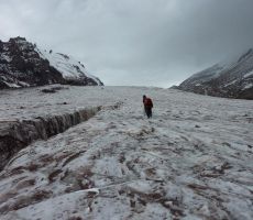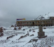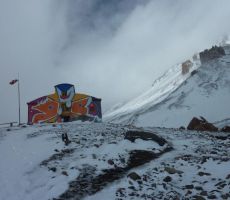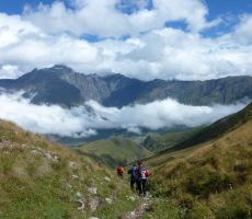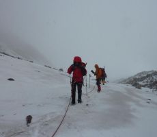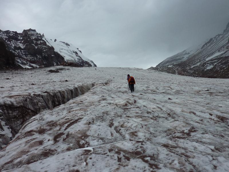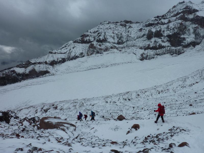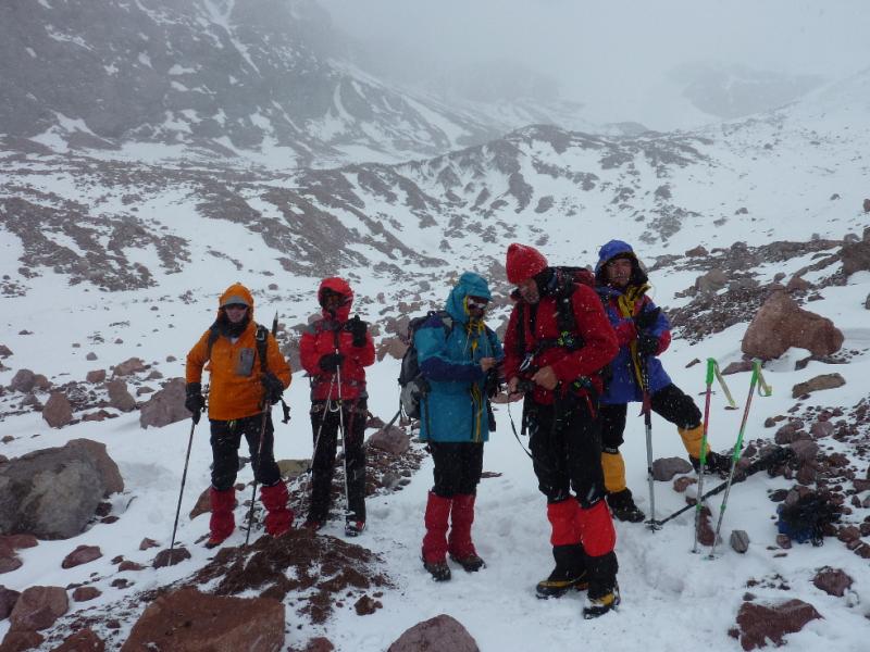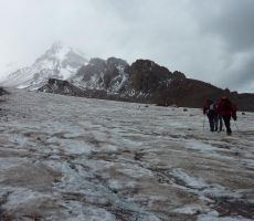 V soboto, 3. septembra smo se iz kraja Stephantsminda - sv. Štefan (1750 m) odpeljali skozi naselje Gergeti do cerkvice sv. Trojice - Tsminda Sameba (2150 m), od koder smo se podali peš do planinske koče Bethlemi (3653 m), nekdanje meteorološke postaje, ki nudi le skromno zatočišče planincem. Z nami sta bila še lokalni vodnik Levan in njegov pomočnik ter kuhar Gigi. Preko ledenika Ortsveri smo v dobrih 5 urah prispeli do koče. Medtem so nam konji prinesli težji del opreme in hrano za nekaj dni. Koča je bila polna planincev različnih narodnosti, veliko jih je prenočevalo tudi v šotorih. Naslednjega dne smo se odpravili na aklimatizacijsko turo v smeri Platoja Maili (4500 m), od koder se začenja zadnji del vzpona na Kazbek. V ledeniški navezi smo se povzpeli nekaj nad 4100 m, ko nas je nevihta s sodro in močnim vetrom prisilila k vrnitvi v kočo. Orkanski veter je divjal vso noč in ustvarjal snežne zamete. Ob štirih zjutraj so se številne naveze kljub slabim razmeram odpravile na pot, vendar so se kmalu ena za drugo vrnile v zavetje koče. Še najdlje so vztrajali Čehi. Dan je bil izgubljen, rezervnega pa nismo imeli, saj smo morali biti naslednjega dne že na letališču v Tbilisiju, od koder smo se preko Istanbula vrnili domov. Ostali so močni vtisi iz veličastnega kavkaškega pogorja in morda v prihodnosti še enkrat poskusimo srečo na ugaslem vulkanu Kazbeku, na katerem naj bi, po legendi, bogovi priklenili Prometeja.