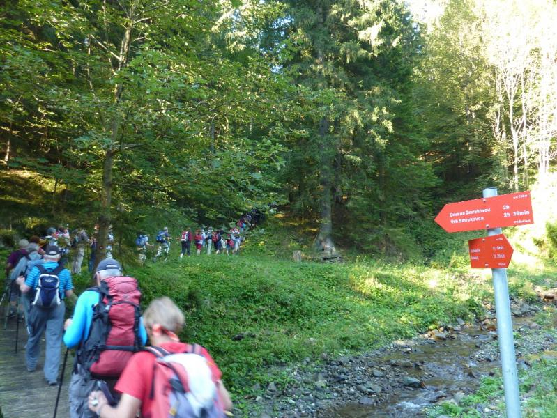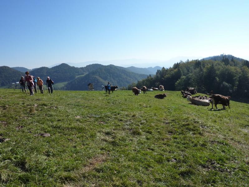 Z našimi prijatelji se dobimo v Velenju, rudarskem in industrijskem mestu, zgrajenem po drugi svetovni vojni. Skupaj nadaljujemo pot po Šaleški dolini in se vzpnemo do hribovskega zaselka Bele Vode. V bližini je med drugo svetovno vojno padel partizanski pesnik Karel Destovnik Kajuh. Njemu v spomin so pred podružnično šolo, ki je bila zgrajena leta 1961 postavili spomenik, delo kiparja Marjana Keršiča Belača. Mi pa se zapeljemo še do sedla pod sv. Križem, gore, ki se je včasih imenovala Oslovska gora. Od tu nadaljujemo pot peš, po kolovozu potem pa po mehki stezi skozi gozd, ki se že odeva v jesenske barve, do Doma na Smrekovcu (1377 m). Tu imamo krajši počitek. Po počitku nadaljujemo skozi gozd do vrha, kjer je lep razgled. Pred nami so Olševa, Peca, Uršlja gora, Pohorje, Paški Kozjak, pod nami pa Šoštanj. Pot nadaljujemo malo po svoje saj imamo zanesljivega vodnika Toneta, zato ni bojazni, da bi zašli. Hodimo skozi gozdove in čez pašnike do Andrejevega doma na Slemenu, ki stoji na prisojni jasi. Leta 1952 so ga postavili šoštanjski planinci in delavci Tovarne usnja Šoštanj. Tu nas čaka naš avtobus. Mi pa »zavijemo« v dom, kjer se podpremo z okusnim ričetom. Po okrepčilu in prijetnem klepetu se odpeljemo do Velenja, kjer se poslovimo od naših prijateljev. Koroško planinsko pot smo zaključili, vendar se drugo leto ponovno snidemo, popeljali nas bodo še malo onkraj državne meje, ki je tako globoko razdelila Korošce. Imeli smo se lepo kot vedno z našimi prijatelji.