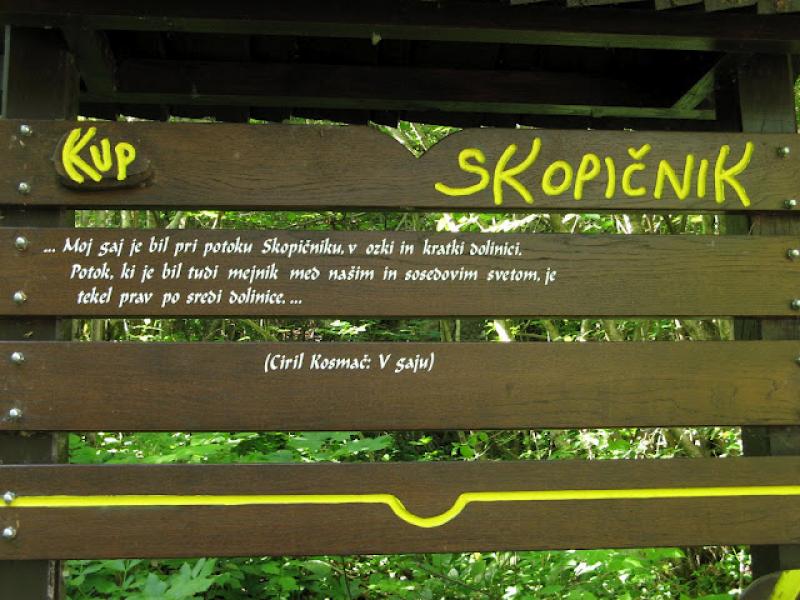 Pri potoku vstopamo na Kosmačevo učno pot. Nanjo opozarja informacijska tabla.