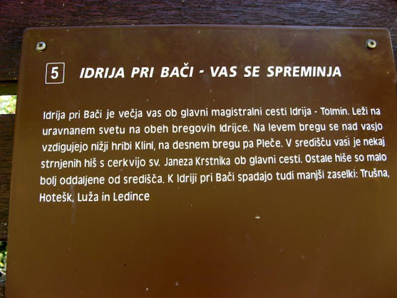Pred mostom ob cesti proti Ljubljani je tabla z zemljevidom Kosmačeve učne poti. Sledimo kažipotom in nadaljujemo po levem bregu reke skozi zaselek Hotešk do mosta čez Idrijco.