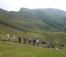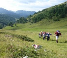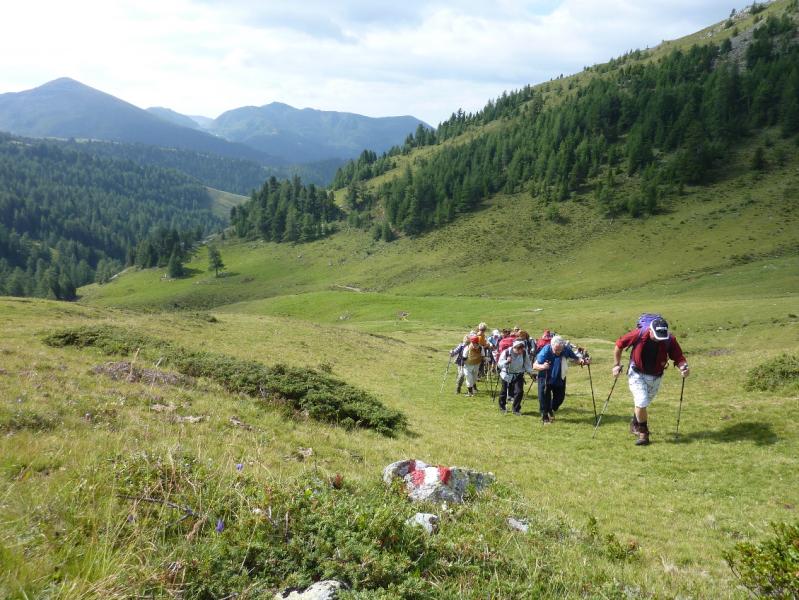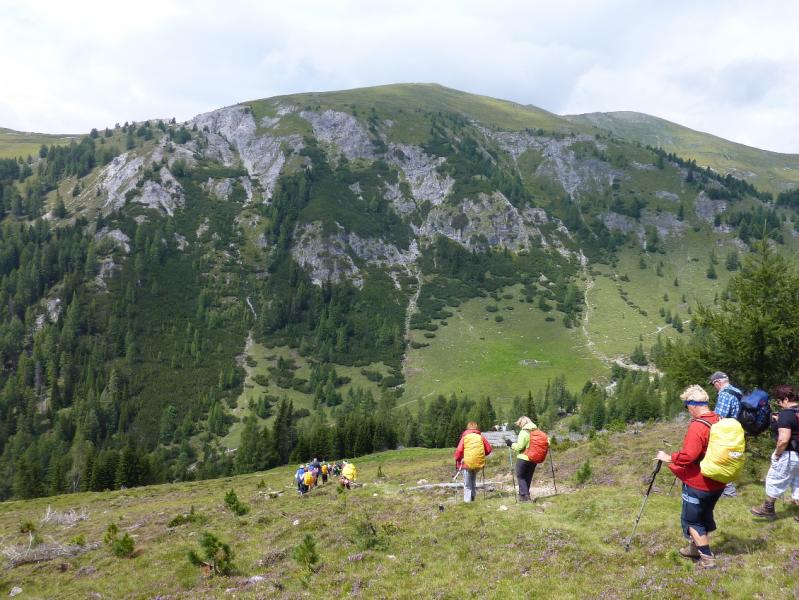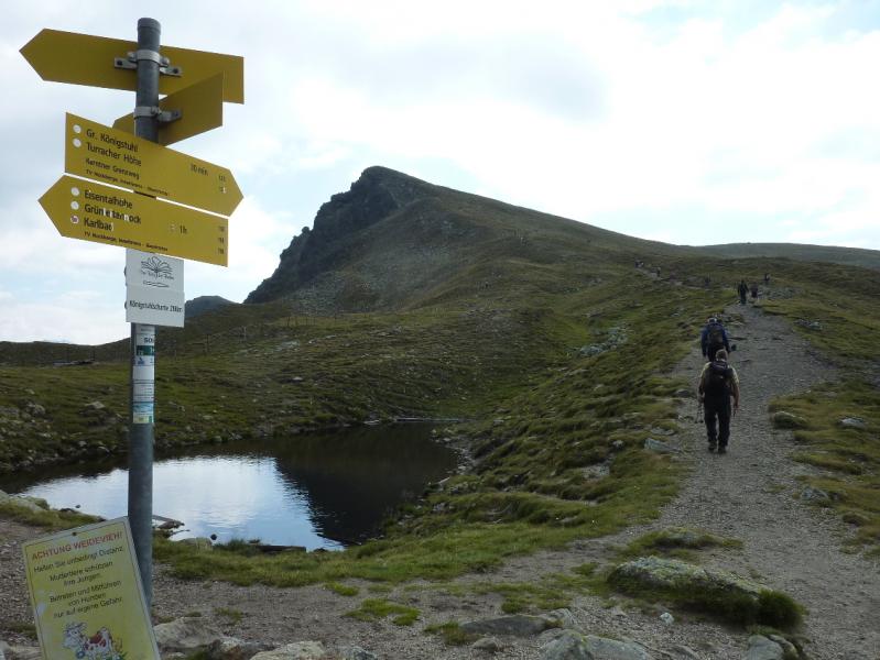 Vrh v Narodnem parku NOCKBERGE, ki je stičišče treh avstrijskih dežel - Koroške, Štajerske in Salzburške, smo »osvojili« 11. avgusta 2012. Uresničili smo želje vseh tistih, ki so jim značilne gore v tem višavju ljube in so lani, po vzponu na Mirnock /2110 m/ izrazili željo, da bi se povzpeli še na katerega med njimi. Na pot proti Avstriji smo se podali vedoč, da so v času poletne sezone Karavanški predor in ceste zatrpane z več kilometrskimi kolonami avtomobilov, namenjenih proti morju. Vendar v zgodnjih jutranjih urah nismo imeli večjih težav. Razen tega, da smo zaradi vseh številnih cestnih omejitev po trasi ob Osojskem jezeru in raznih zaselkih od Beljaka do Ebene Reichenaua, kjer smo se odcepili na znamenito, 35 km dolgo alpsko cesto /Nockbergestrasse/, do prvega počivališča na višini 2027 m, pri razgledni koči Glockenhütte, prispeli šele po osmi uri. Po obveznih jutranjih napitkih, smo se s te višinske točke spustili do kulturno-zgodovinskega unikata KARLBAD /1693 m/, edinstvene domačije s 300-letno tradicijo posebnega kopališča za zdravljenje revmatizma idr. bolezni. Tu je bilo izhodišče našega vzpona na Königstuhl.Sonce, ki je na začetku vzpona obetalo izjemno vročino, kakršne smo deležni v tem mesecu, se je kmalu skrilo za oblake in na vrh je 30 udeležencev izleta dospelo v razmerah, ki so bile vse prej kot primerne za daljši postanek za razglede in počitek. Tega smo si privoščili šele po nadaljevanju hoje čez Karlnock in Stangnock /2013 m/, na travnatem pobočju pod tem vrhom, dokler ni začelo najprej rositi, nato pa kar resno deževati. Spremenljivo vreme nas je nato spremljalo vse do povratka v Ljubljano.Po dveh urah spusta čez prekrasna pobočja, kjer smo okusili borovnice in še nezrele brusnice, smo se vrnili na domačijo Karlbad, katere solastnica je tudi brhka Slovenka iz Podkorena. Po krajšem počitku smo nadaljevali vožnjo po alpski cesti proti Innerkremsu, kjer zavije cesta proti Spittalu. Na poti smo se ustavili še na najvišji točki te alpske ceste, pri postojanki na vrhu EISENTALHOHE, 2042 m, kjer so se nekateri okrepčali, vsi pa nedvomno naužili razgledov po mogočnih avstrijskih vrhovih. Obljubljeno kopanje v Millstatskem jezeru je seveda odpadlo, saj je močno bril severni veter in tudi dež ni prizanašal. Zastojem na avtocesti smo se izognili z vožnjo čez ovinkasti prelaz Ljubelj.
