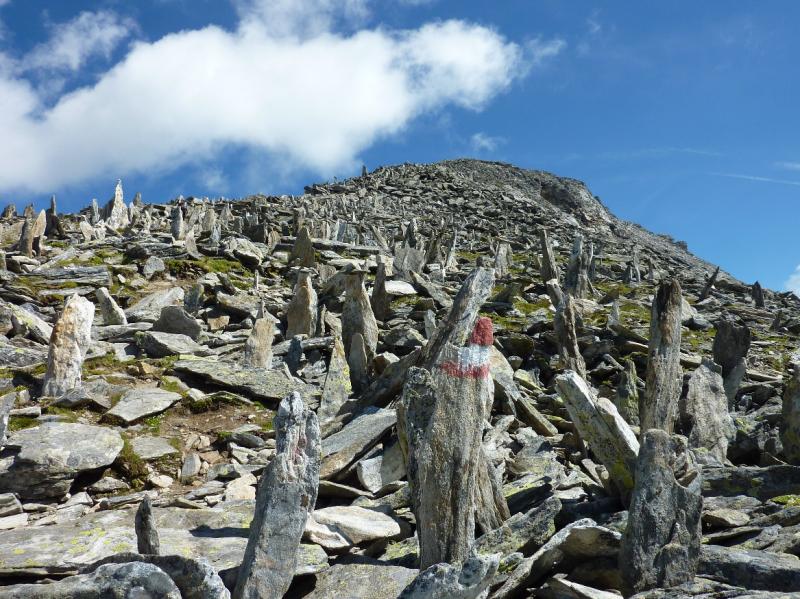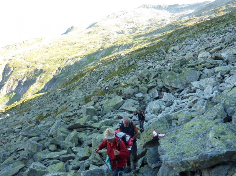 Ob 6.30 smo se že odpravili na dolgo pot do planinske koče Kattowitzerhutte (2320 m). Za vsega 400 m višinske razlike smo porabili cele 3 ure hoje. Po krajšem postanku in okrepčilu smo začeli vzpon na tritisočak Hafner. Pot nas je nekaj časa vodila po travnatih strminah, na katerih so se pasle ovce in krave. Nadaljevali smo po razdrapanem skalovju, mestoma zavarovanem z modrimi vrvmi, na katerem je bilo treba tudi malo poplezati, dokler nismo prispeli na široko ravnino, posejano s s pokončnimi špičastmi skalami, ki jih planinci radi postavljajo v spomin na turo. Bližina 3000 metrov nad morjem se je že poznala, zato smo ta kraj izkoristili za kratek oddih pred zadnjim vzponom na vrh. Skalnati vrh z obveznim križem nam je nudil lepe razglede na bližnjo Hochalmspitze (3360 m) in nekoliko bolj oddaljeni Ankogel (3250 m), izza katerega so kukali Grossglockner, Sonblick in drugo orjaki, proti jugovzhodu so iz oblakov štrleli vrhovi Škrlatice, Triglava in Mangarta... Med občasno močnim vetrom smo sestopili nazaj do koče, kjer smo se pogreli z vročo juho, žigosali dnevnike in se odpravili nazaj do jezera Kolnbrein, kjer smo se po več kot 12 urah z olajšanjem preobuli v sandale. Ni kaj, tura je dolga in naporna, česar se mora zavedati vsak, ko se odloča za takšen podvig - za koga med nami je bil napor morda celo malce prehud. Vožnja domov je minila med dremežem in kovanjem načrtov za prihodnje visokogorske ture.