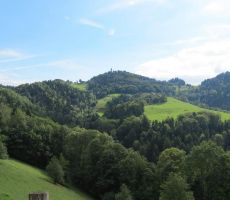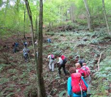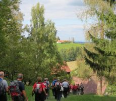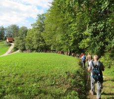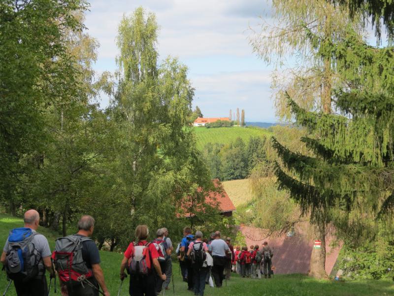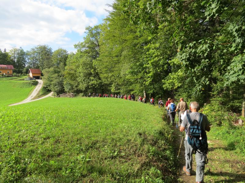 Hojo smo začeli v Ožbaltu, kjer se nam je pridružil vodnik Tone Cepec, predsednik PD Ožbalt-Kapla in nekaj njihovih članov. Po nekajminutni hoji po asfaltu smo zavili strmo v gozd, koder je po pripovedovanju Toneta pred leti hodila klena 70-letna ženica po živež v dolino. Pri njeni domačiji, ki zdaj sameva, smo naredili krajši postanek. Pri naslednji samotni hiši, kjer gospodarja ni bilo doma, nam je koroški sopotnik Branko pripravil prav poseben literarni užitek s poučno zgodbo o očetu, dveh sinovih in delitvi dediščine pa še hudomušno zgodbo o nesenju jajc. Skozi gozd so se nam vedno bolj odpirali razgledi na visoko stoječe koroške domačije na vrhovih zaobljenih hribov. Povzpeli smo se na Grilov vrh (865 m) in si privoščili krajši počitek za malico in uživanje v lepih razgledih na Dravo pod nami ter na Pohorje, Peco, Uršljo goro... Nasmejani po Brankovi pripovedi o sodobnem zdravem prehranjevanju, smo nadaljevali pot mimo samotnih domačij do Sv. Duha na Ostrem vrhu (903 m). V gostišču, kjer na dvorišču kraljuje 323 let stara lipa, nas je čakala malica, okusna obara in 'flancati'. Zapustili smo koroške vrhove in se po Obmejni panoramski poti, ki je speljana delno po slovenski in delno po avstrijski strani meje, mimo domačije z dobrim moštom in mimo starega mlina, spustili do Gradišča na Kozjaku, kjer nas je čakal avtobus.
