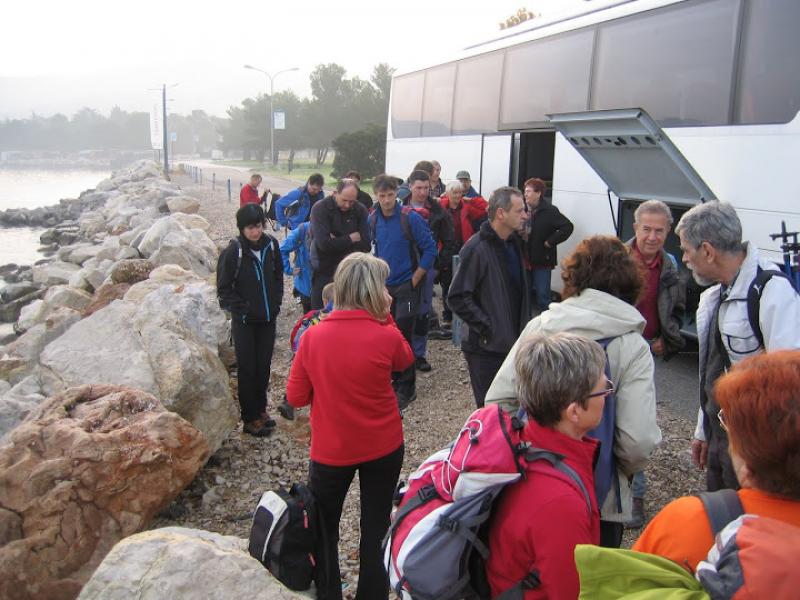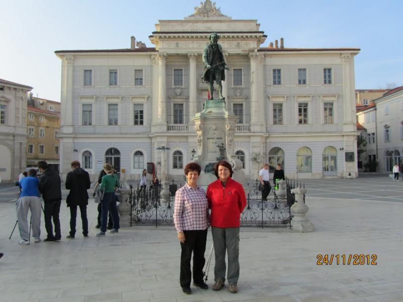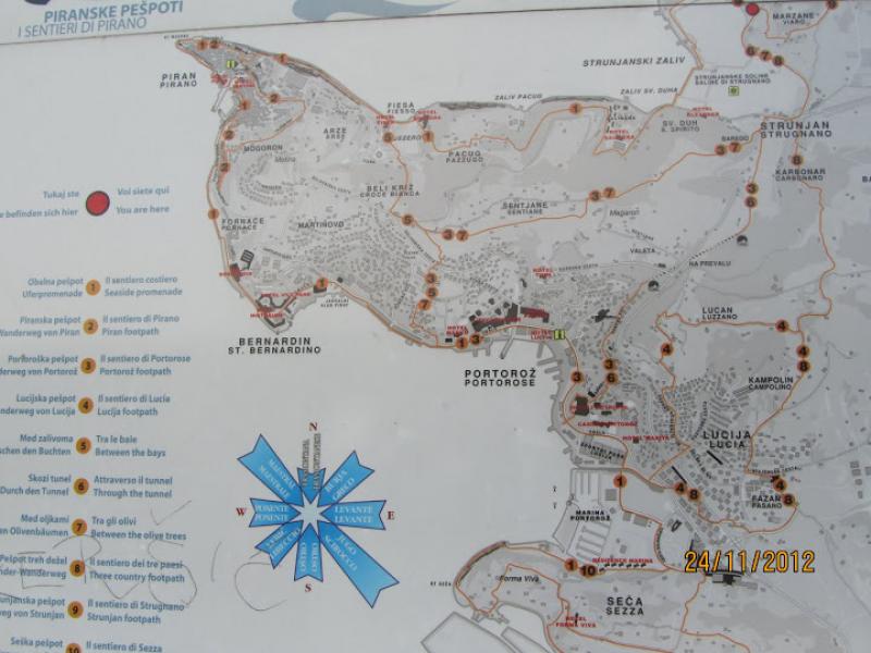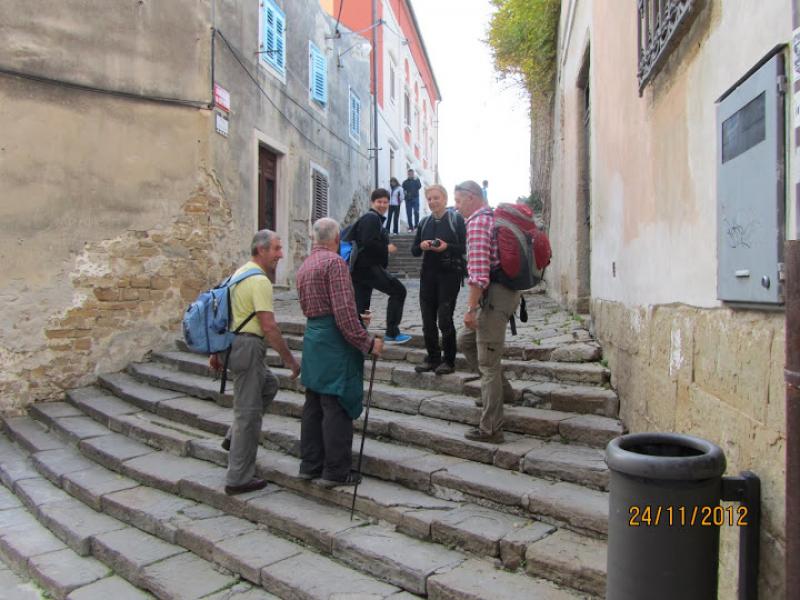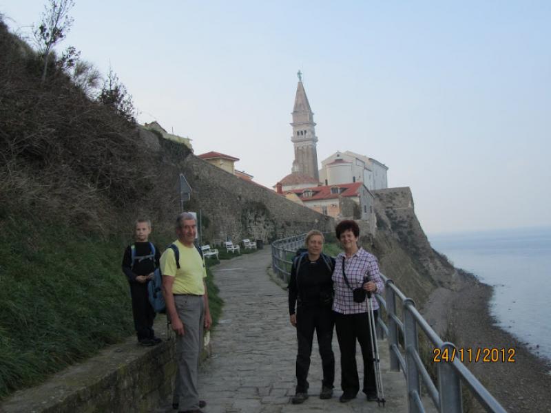 Na lep sončen dan 24.novembra 2012 nas je novi predsednik Planinske skupine Pošte in Telekoma Nova Gorica popeljal na zaključni izlet od Izole do Pirana. Izpred pošte v Novi Gorici smo se zapeljali po italijanski avtocesti, kjer se je iz megle svetlikalo jutranje sonce. Z avtobusa smo izstopili blizu ladjedelnice v Izoli, pripešačili do centra, popili prvo kavico in se podali proti Simonovemu zalivu. Izza ograje smo si lahko ogledali ostanke in mozaični tlak vile Rustice, ki je pripadala pristanišču Haliaetum, katerega pomol je še vedno viden v morju ob oseki. Prvotno naselje, ki je cvetelo v 1. in v 2. stoletju, je bilo uničeno, prebivalci pa so se zatekli na bližnji otok, kjer so postavili temelje današnje Izole. Turistična vodnica Irena nam je povedala, da so že v rimskih časih tod okrog gojili oljko in trto, prav tako so bili že takrat razširjeni ribištvo in solinarstvo. Sicer pa so se