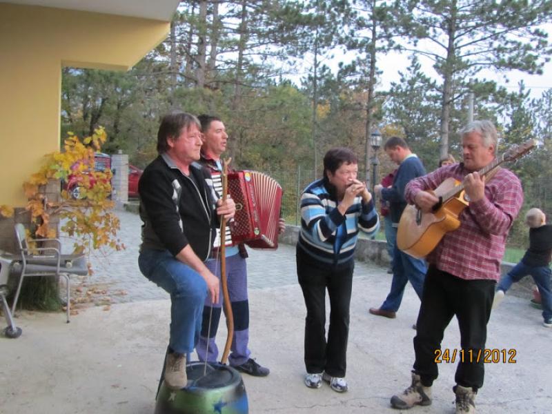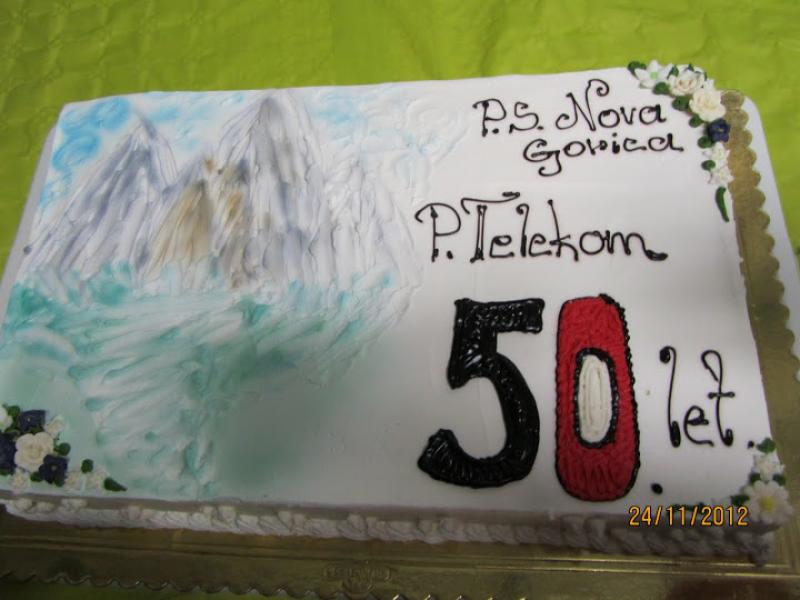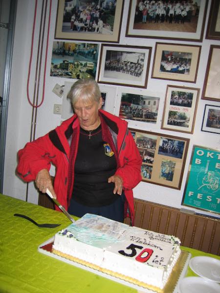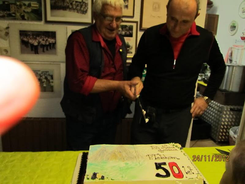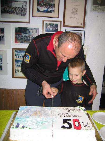 Tamkaj nas je pričakovalo pozno kosilo in kar šest muzikantov, s tem da smo jih pet imeli že sami. Lahko si mislite, kakšno je bilo vzdušje , ko je 11 muzikantov godlo le enemu avtobusu ljudi. Višek izleta oziroma praznovanja pa je bil razrez torte ob 50-letnici delovanja naše planinske skupine. To je opravil novi predsednik Ivan Trampuž s pomočjo prejšnjega dolgoletnega predsednika Rudija Perozzija. Trampuž se je v prvem letu delovanja v svoji vlogi zelo dobro izkazal in tudi Perozzi je priznal, da je dobil dobrega naslednika.