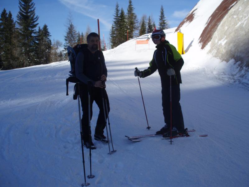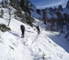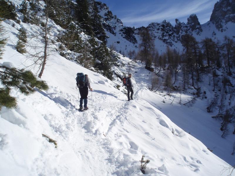 Po znameniti romarski poti (poledenelo) iz vasi Lussari do odcepa za planino Malga di Lussari (nova pešpot, ki pelje na Višarje oziroma na odcep za Kamnitega lovca), na sedlu smo si pri znamenju (spominska plošča Lucca Verschica) odcepili na pot za Kamnitega lovca. Potrebno si je bilo nadeti krplje, ker se je zelo prediralo, in
