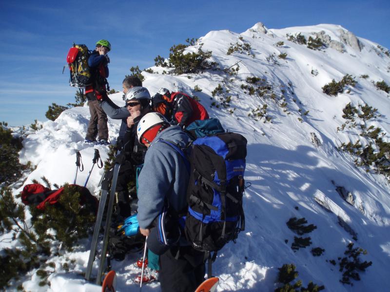 nadaljevali do vstopne jeklenice pod vrhom Kamnitega lovca. Tukaj je bil sneg nepredelan, tako da sem po nekaj metrih neuspeha se odločil, da se raje povzpnemo na desno sedelce zraven vrha, kjer so že bili štirje Trebanci.