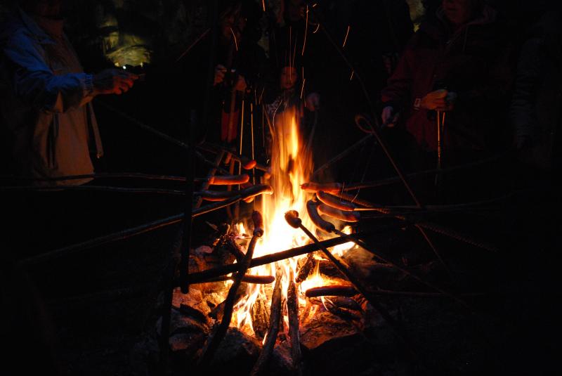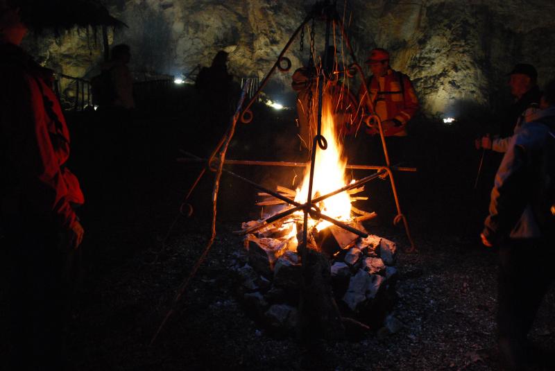Že smo pred Krompirjevo jamo. Menda je ime dobila po skladiščenju krompirja, med prvo vojno pa je služila kot bivališče kakim 500-tim avstro - ogrskim vojakom. Odkrili so jo zaradi luknje v stropu, ki sedaj služi kot nekakšen dimnik, medtem ko sta vhod in stopnišče umetno narejena. Vodnika sta nam povedala še marsikaj zanimivega, npr. kako so bili vsi vhodi v bunkerje obrnjeni zaradi italijanskega obstreljevanja proti vzhodu, italijanski pa seveda ravno obratno. Jama je osvetljena, znana pa je po živih jaslicah, ki jih prirejajo zadnja leta. Nam pa so pripravili klobase, ki smo si jih sami pekli na ognjišču v jami. Ta način pečenja klobas, da jih natakneš na dolgo palico, so pogruntali prav tukajšnji jamarji, ki se tako krepčajo po kakšni akciji.