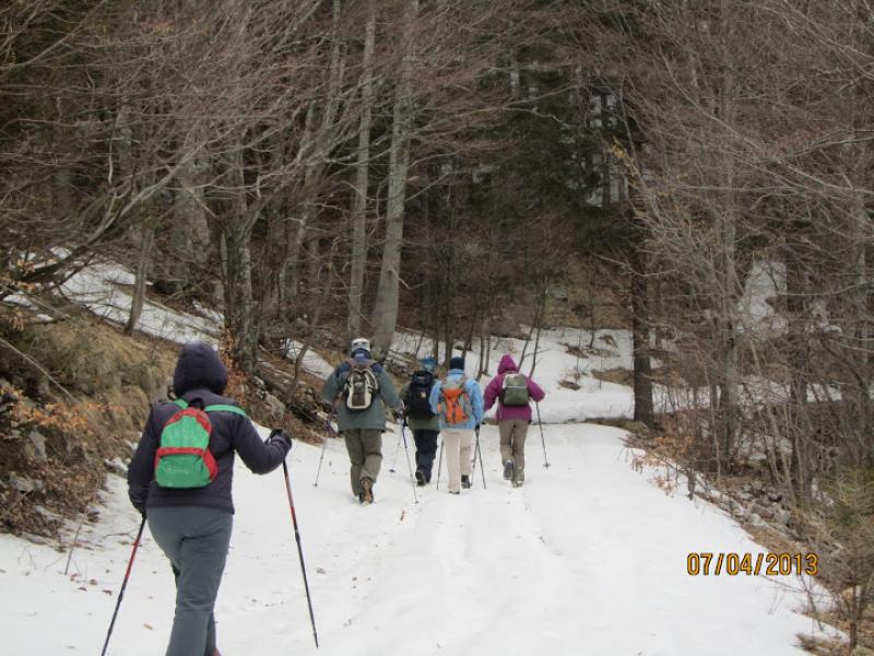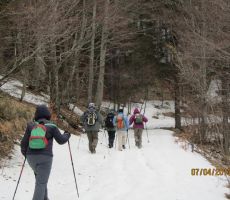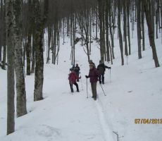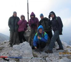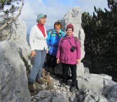 izmed udeleženk reče: »poglej Krn«. Vsi smo se zazrli v daljavo in gledali kje le naj bi bil Krn, pa smo videli le megleno gmoto. Potem pa le vprašamo, kje je videla Krn, pa se Hmeljak postavi pred skalo, jo objame in pravi: ja tukaj je. Ali ne vidite? Prav v obliki Krna. Tako smo potešile radovednost, še malo smo poklepetali in hajdi naprej proti Velikemu robu. Bolj kot smo se po grebenu približevali robu bolj se je krepil mraz, tako da smo nase zvlekli rokavice, pa kape in podkape ter bunde. Na vrhu je tako pihalo, da smo komaj pokusili malo ta močnega, potem pa smo hitro sestopili in poiskali mirno zavetje, kjer bi nekaj pregriznili. Na tleh smo zagledali same kakce od divjadi- tudi oni vedo, kje je miren kotiček. Pri sestopu smo imeli zasneženo pot. Nekdo je s motornimi