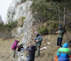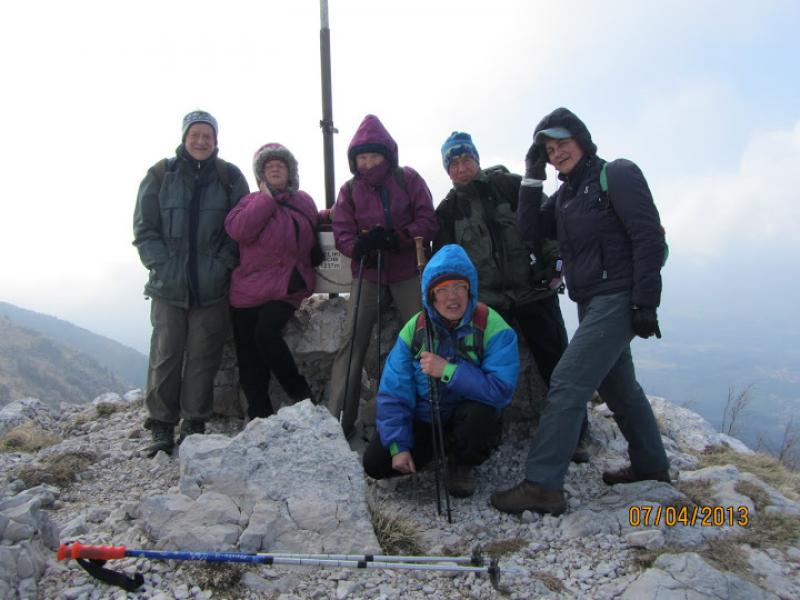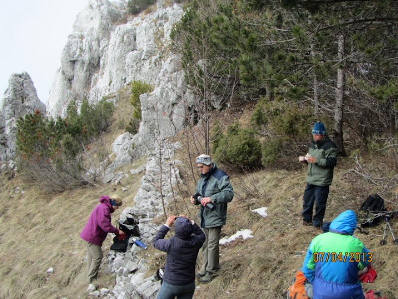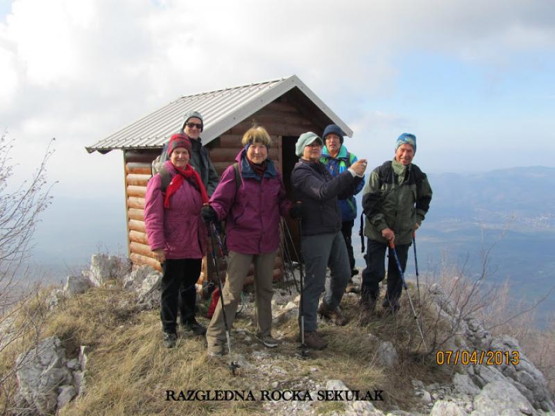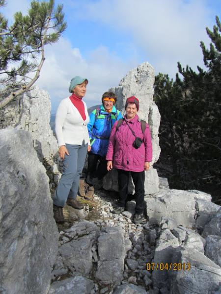 Hmeljak. Že so bili komentarji, da bo blažen med ženami, da bo lahko izbiral, pa se je prikazal še nekdo- zdi se mi da je Drago. Zapeljali smo se proti Trnovem in še malo naprej, kjer smo pričeli našo pot. Darij nas je opozoril naj se le dobro oblečemo, saj zna kar precej pihati burja, kar je za ta kraj značilno. Pot ni bila preveč naporna, bolj sprehajalna. Po urici hoda smo prispeli do čudovite razgledne točke.