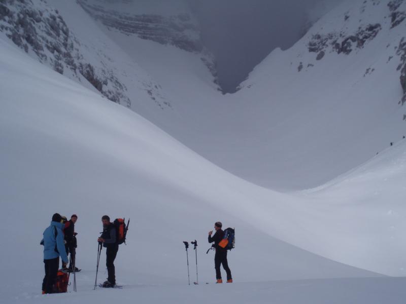 razmere bila potrjena ideja da se preusmerimo na Škrbino Prednje Špranje (Lavinal dell Orso). Odločitev je bila prava, kar so nam potrdili tudi Bovški reševalci, ki so se spustili z omenjene Škrbine. Tako da smo nadaljevali z vzponom do Škrbine Prednje špranje. Kratek počitek smo naredili po zadnjem zahtevnim vzponom (pijača in sadje) in naskočili še zadnjih 100 višinskih metrov, ko se nam je odprl pogled na Škrbino. Na Škrbini Prednje Špranje (LAVINAL DELL ORSO 2138m) pa so bili zelo močni vetrovni sunki, tako da nas je kar zmrazilo in smo hitro se vrnili na prejšnje počivališče.