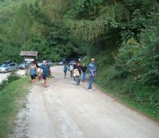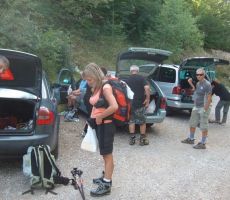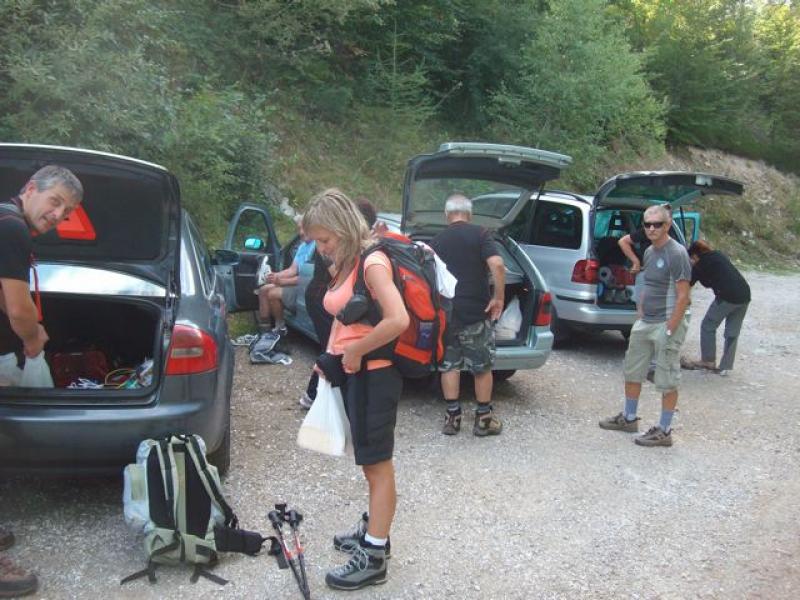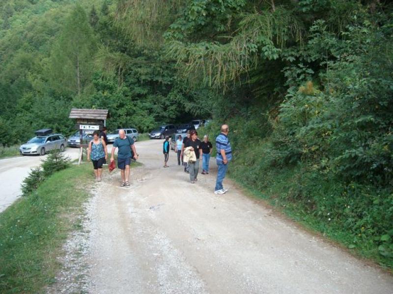 Iz Tolmina, kjer je naša zbirna točka, smo se z nekaj avtomobili peljali skozi Poljubinj in Ljubinj, mimo koče na planini Stador in tisti, ki smo se odločili za "ta dolgo" do naše koče, smo parkirali avto na planini Lom; večina, zlasti mlajši, pa so pohiteli z avti do parkirnega tik pred Triglavskim narodnim parkom oz. pred planino Kuk, da bi se pravočasno povzpeli na Vogel. Med potjo smo se ozirali za gobami, čeprav smo vedeli, da je je šele