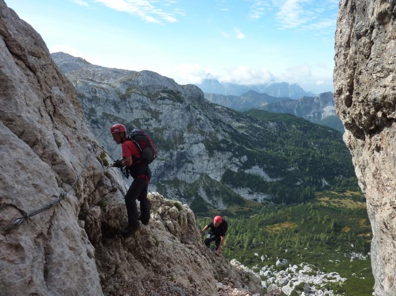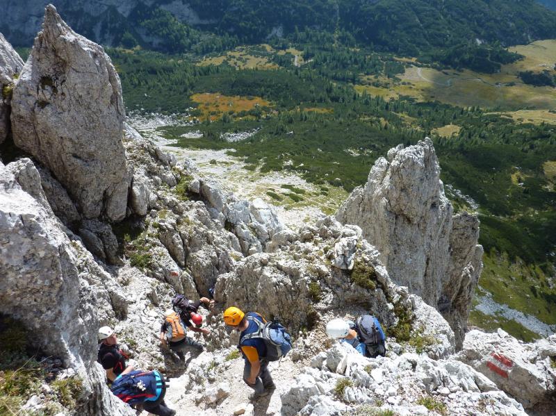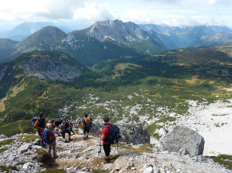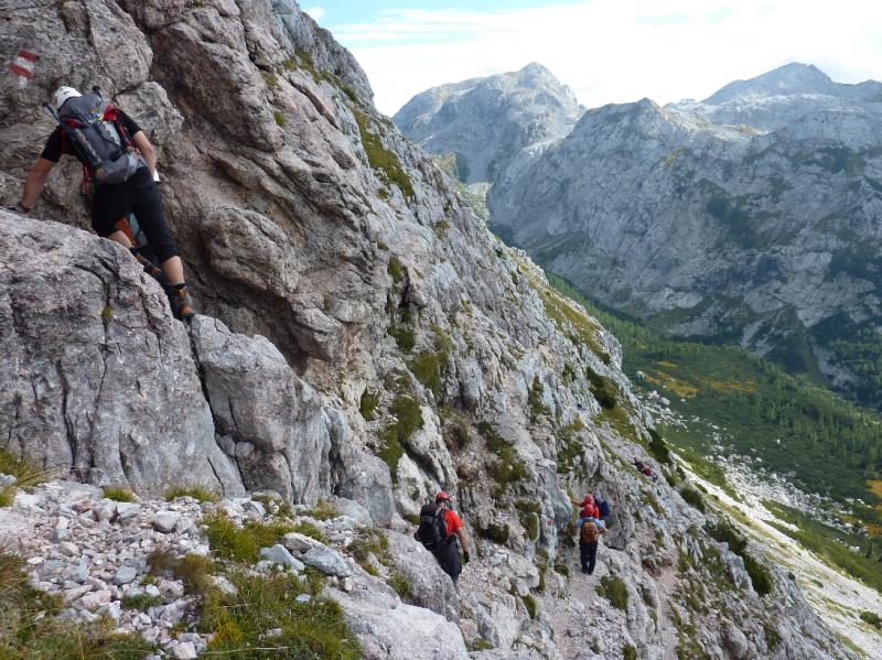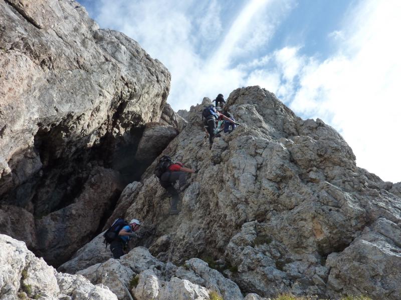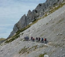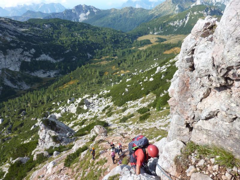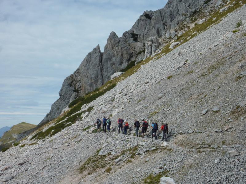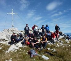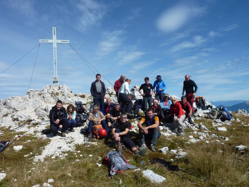 Čez Cason di Lanza - Slovenci so prelazu nadeli ime Lonice - je bila letos speljana etapa dirke Giro di Italia, s ciljem v Trbižu. Novogoriški in ljubljanski planinci pa smo si ga vzeli za izhodišče planinskih tur na okoliške vrhove. Pred leti smo se povzpeli na bližnjo Zermulo in na sosednji Zuc della Guardia. Letos pa si je vodnica Ingrid izbrala 2279 m visoki vrh Veliki Koritnik, italijansko Creta di Aip, nemško Trogkofel, na meji med Italijo in Avstrijo. Ob 8. uri zjutraj smo se iz Pontebbe skupaj pripeljali na prelaz Lonice, od koder se nas je vseh 19 odpravilo proti našemu vrhu. Na vrh smo se povzpeli po kratki zavarovani poti Via ferrata Crete Rosse. Sestopili pa smo v smeri običajnega pristopa na goro, ki pa je brez varoval in zato celo zahtevnejši od naše ferate. Nadaljevali smo po državni meji, ob kateri je tudi po 100 letih še veliko vidnih ostankov bunkerjev in strelskih jarkov iz I. svetovne vojne. Med potjo smo si ogledali vhod v jamo Grotta di Attila, ki se v meandrih vije v podzemlje. Sprehod preko planin je ponujal lepe razglede na bližnja in daljnja pogorja, vse do Grossglocknerja in drugih tritisočakov. Narava že začenja dobivati jesenske barve, tako da se bo treba vrniti prihodnji mesec, ko bodo zažareli macesni.
