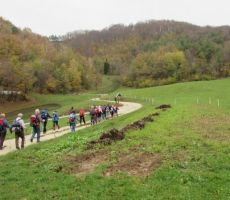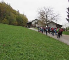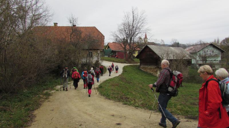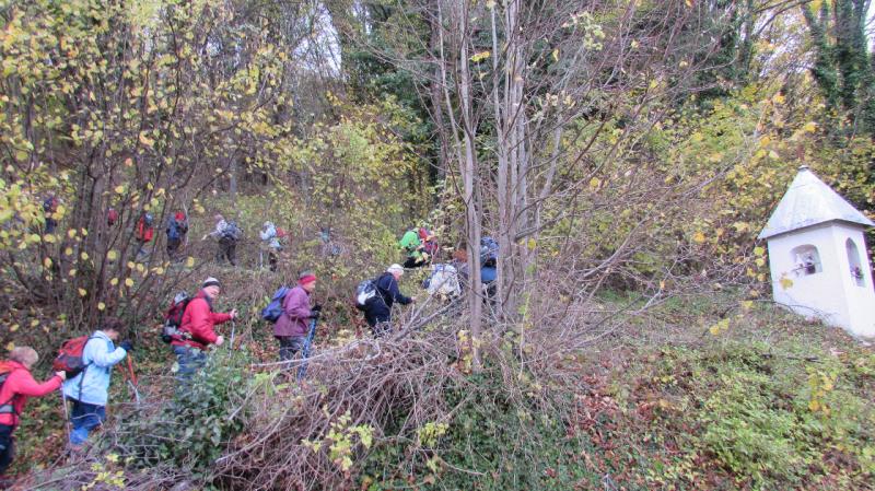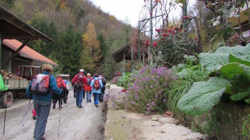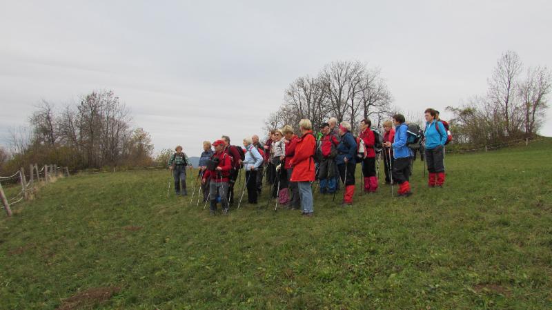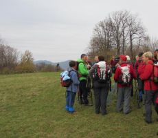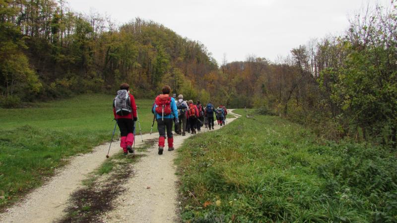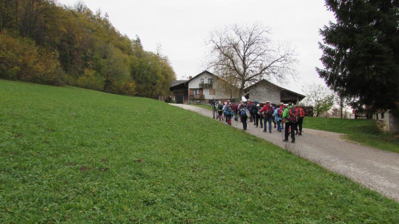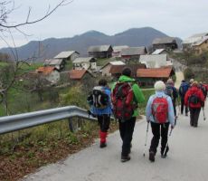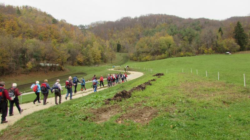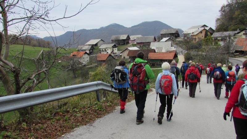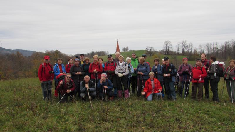 V četrtek, 14. novembra 2013 smo se seniorji Planinskega društva Pošte in Telekoma Ljubljana, kot običajno zbrali ob 7. uri na ljubljanski avtobusni postaji. Po avtocesti smo se odpeljali mimo kraja Trebnjega, nato smo krenili v Mirensko dolino. V vasi Mirna smo prečkali zgodovinski most in nadaljevali vožnjo ob znani tovarni pijač Dana. Kmalu smo na levi strani, na hribčku zagledali Veselo goro s cerkvijo Sv. Frančiška, z dvema zvonikoma, ki nase opozarjata z mirenske in šentrupertske strani. Na desni strani, v daljavi smo zaznali kaznilnico Dob, na hribu pa izletniško točko Debenec. Vozimo se skozi vasi Rakovnik, Prelesje, kjer je bil rojen Ivan Steklasa, profesor zgodovine, ki je napisal Zgodovino Župnije Šentrupert na Dolenjskem. Peljali smo se mimo vasi Bistrica, ki slovi po najlepšem kozolcu na Slovenskem. Na koncu vasi smo zavili levo po bližnji cesti skozi vas Hrastovica in se kmalu priključili na cesto Mokronog - Sevnica. Vozili smo se ob reki Mirna vse do Boštanja, kjer so nas pri trgovini Mercator čakali sevniški planinci. Sledili so pozdravi, nato pa dogovor vodnikov o poteku pohoda. Odpeljali smo se v Trnovec, kjer smo začeli naš pohod, sprva po cesti, nato po stezi in kolovozu in kmalu prispeli do cerkvice Sv. Jurija. Sledil je ogled, potem smo pot nadaljevali na Pokojni vrh, 747 m. Med hojo smo opazovali razpadajoče domačije, hiše in gospodarska poslopja, kmetije z velikimi travnatimi površinami, na katerih se je še pasla živina. Na poti smo si ogledali tudi kmetijo, ki je bila v večernih urah na TV šov programu. Sedaj sameva brez vidnega življenja, zmagovalec, ki je kmetijo dobil, je ne zna obdelovati, niti tržiti. Na Pokojnem vrhu se nam je odprl razgled na Zasavsko hribovje, Dolenjsko gričevje in tudi na Sljeme nad Zagrebom. Pričeli smo se spuščati proti vasi Zabukovje in Velikemu vrhu, 619 m ter prispeli v Podvrh. Zadnji del poti smo opazovali v strmem bregu zgrajene stavbe oziroma vikende, vinograde, v katerih bi človek moral biti privezan, da se ne bi zvrnil po bregu navzdol. Prehodili smo krožno pot, del poti po Sevniški planinski poti, del po brezpotju, del po makadamski, del po asfaltni cesti, del po stezah in kolovoznih poteh. Pohod smo zaključili v turistični kmetiji Grobelnik v vasi Podvrh. V Boštanju smo se poslovili od sevniških planincev, s katerimi smo skupaj preživeli lep in zanimiv dan. V Ljubljano smo se vračali čez Sevnico, Tržišče, Mirno, Trebnje in po avtocesti do Ljubljane.