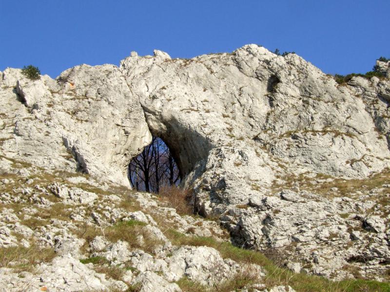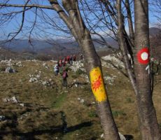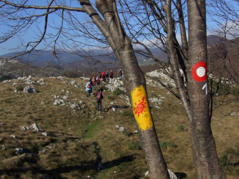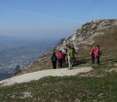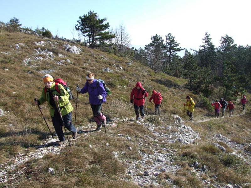 Vzpon smo začeli skozi gozd, više gori smo se izogibali podrtim drevesom, na katerih je burja preizkušala svojo moč. Ko smo dosegli greben, s katerega je prelep razgled po Vipavski dolini, smo se zavili v vetrovke, kape in kapuce, saj je tudi nas pobožala rahlejša mrzla burja, ki nas je potem spremljala vso pot po grebenu. Po dobri uri hoje smo premagali 335 višinskih metrov do vrha Kovka, najvišje točke na naši poti (962 m.n.m.), od tu dalje pa se »Pot po robu« rahlo spušča v razgibanem gori-doli po razglednem robu Rebri in Podrte gore proti Otliškemu oknu. Pred nami je bil ves čas Čaven, med potjo smo si poleg lepih razgledov privoščili tudi brinove jagode, pri kapelici pa udarili še en žig.