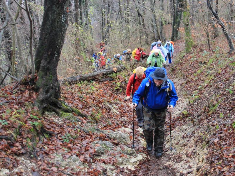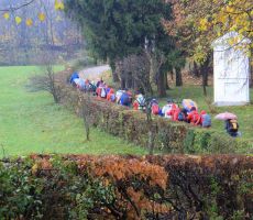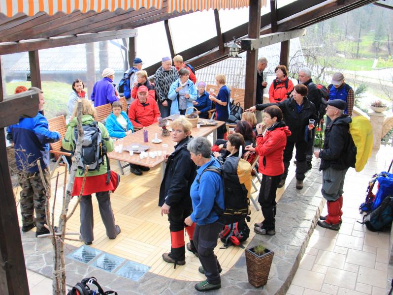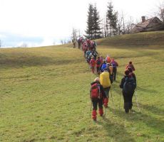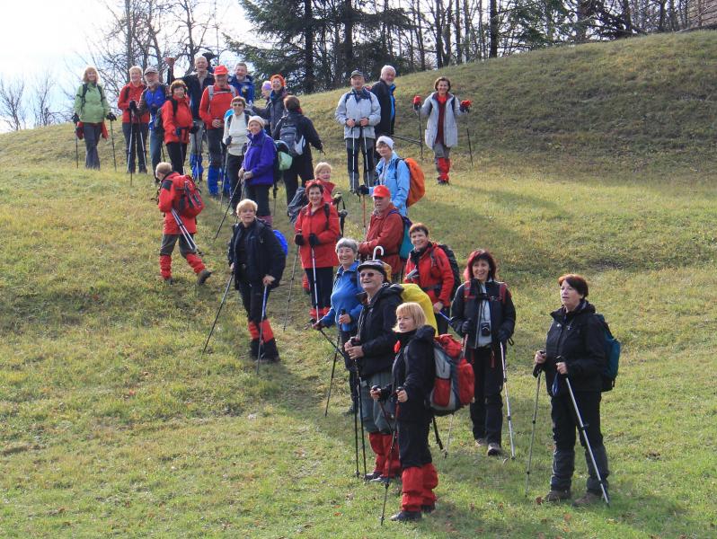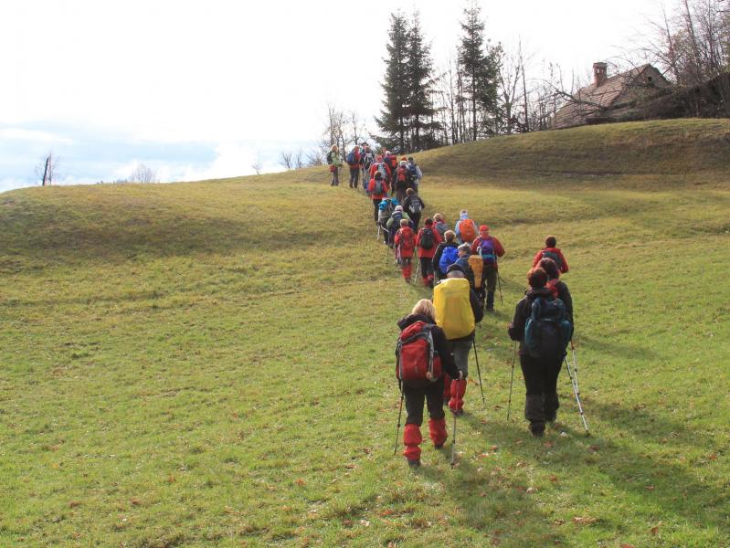 Počasi se je vreme jasnilo in izza oblakov je boječe pokukalo sonce. Pot smo nadaljevali proti naselju Zaplana (to je bila rešitev druge uganke), ki leži na jugovzhodu Rovtarskega hribovja. Po gozdnih poteh je bilo polno listja, prečili smo tudi travnike in pašnike. Tako smo prispeli do naselja Petkovec, ki leži med Logatcem in Rovtami, domačini se ukvarjajo s kmetijstvom in lesarstvom. Ustavili smo se pri prijazni domačinki Juditi, zaposleni na Telekomu, ki nas je razveselila z domačim žganjem, čajem in pecivom. Z veseljem smo segli po vseh dobrotah in tudi počitek se je prilegel. Čakala nas je le še pot do končnega cilja, ena skupina je šla kar po cesti, drugi pa smo šli še malo navkreber po gozdnih stezah do Kmetije odprtih vrat Kisovec (ime gostilničarke Martine je bila rešitev tretje uganke), kjer nas je čakalo zasluženo kosilo - domače koline in zelje in seveda naš muzikant Janez. Preživeli smo lep dan, se sprostili s hojo v naravi in na koncu še s plesom.