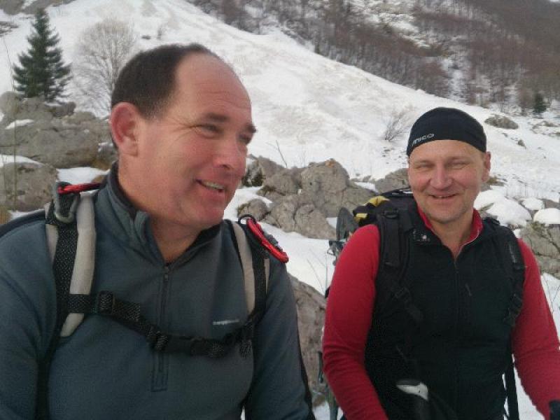 S parkirišča smo startali po markirani poti mimo zapuščenega zaselka Logje in ostankov planine Bala, kjer smo že konkretno zagazili v sneg. Naš prvi cilj je bila lovska koča (1300m), kjer smo imeli daljši postanek in se dogovorili, da gremo proti Preval.