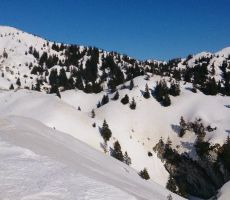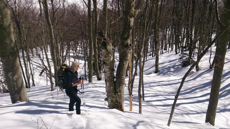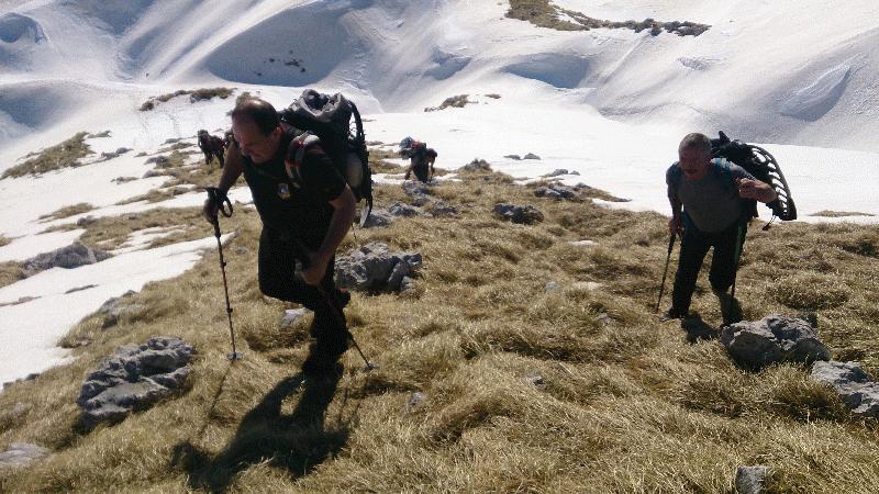 Glede na opremo, smo se odločili za dve smeri sestopa. Prva skupina je sestopila po isti poti do lovske koče, namreč sneg se je že odjužil in tako ni bilo več težav. Druga skupina se je odločila za pomrzjeno snežišče in prečenje preko DEBELJAKA do lovske koče, bolj zahtevno. Zato je bil skupni dogovor, da se dobimo na planini Zaprikraj. S planine Zaprikraj smo skupaj sestopili mimo planine Zapleč in po markirani stezici proti slapu Curk, kjer nas je na poti presenetil pogled na zelo velik snežni plaz, ki smo ga morali preči. Sestop se je nadaljeval po opuščeni mulatjeri, kjer je bilo mnogo polomljenega drevja, očitno je tudi tu šla mimo huda ura. In pot nas je pripeljala naravnost do korita, kjer smo imeli parkirane avtomobile. Čudovita in lepa krožna pot.