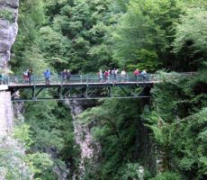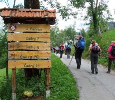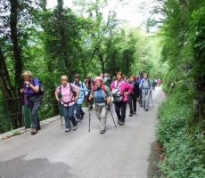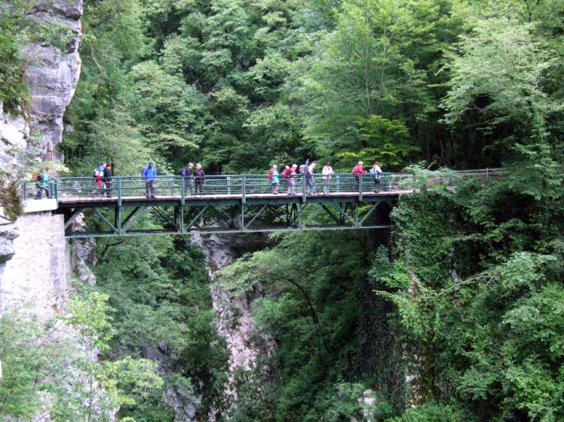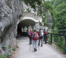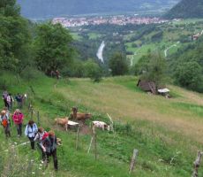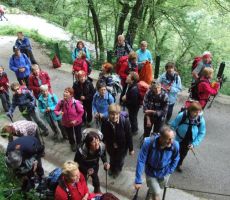 V dolino smo se vračali po krožni poti, iz vasi smo se spustili do Tolminke, jo prečili po visečem mostu in se po cesti, ki vodi do Javorce in do planine Polog, vrnili mimo cerkve Sv. Petra nazaj do izhodišča pri Tolminskih koritih. Ko smo zadovoljili kruleče želodčke z dobrim ričetom in s Kobariškimi štruklji ter se začeli odpravljati proti domu, nas je na parkirišču zopet presenetil gospod Ludvik, ki je takrat zaključil svoj folklorni nastop v Tolminu.