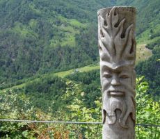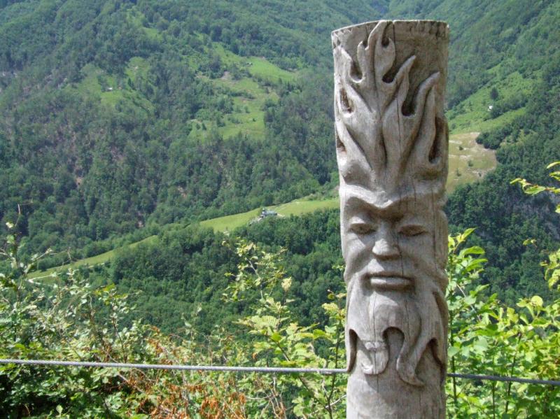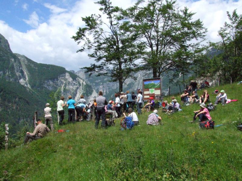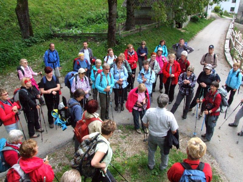 Pridružila sta se nam domačina, gospod Ludvik Janež, domači »turistični vodnik« in ljudski pripovednik, član folklorne skupine Razor, poln iskrivih domislic, in gospod Gorazd Kutin, nadzornik v TNP-ju, ki sta nam imela veliko povedati o teh krajih. Vas je že na taki višini, da vodijo živino DOL v planino na pašo. V vasi poznajo kar 27 starih sort hrušk, najstarejše hruške imajo svoja domača imena. Skozi vas smo se sprehodili do razgledne točke ŽLEJŽN, občasno prireditvenega prostora, kjer se zbirajo mladi. Ti so s svojimi rezbarijami v lesu dali prostoru svojevrsten pečat. Od tu so se nam odprli čudoviti razgledi na hribe nasproti: Vodilj vrh, Mrzli vrh, Visoč vrh s planinami zanimivih imen, kot so Pretovč, Medrje, Laška seč, Črča, Sleme. Zagledali smo se v ostenja Rdečega roba, Mahavščka (Velikega Bogatina), planini Polog in Prodi, v Javorco s cerkvijo Sv. Duha iz 1. svetovne vojne. Po ogledu ostankov »frnaže« (peči za žganje apna) smo se odpravili v nakup sira in skute, pa doživeli presenečenje - sir nam je prodajal Jani Kutin, »tolminski puntar« iz dueta Bakalina, ki poje pesem Banda kravatarska, gotovo ste ga že slišali.