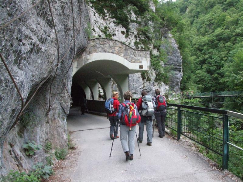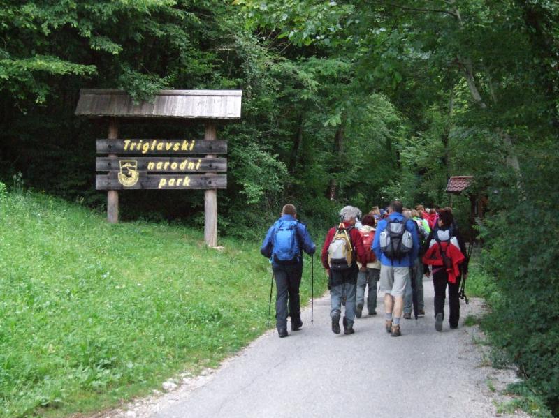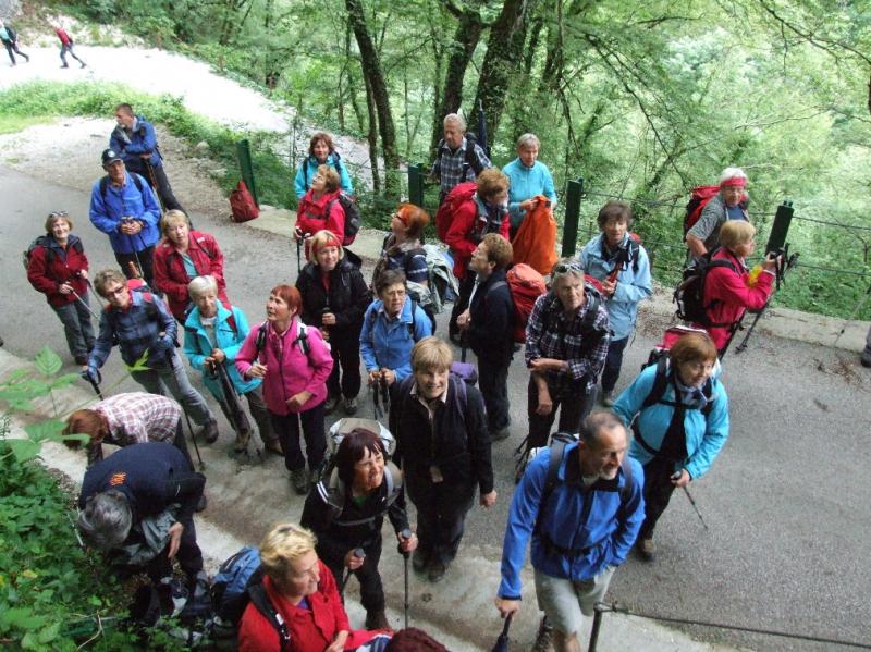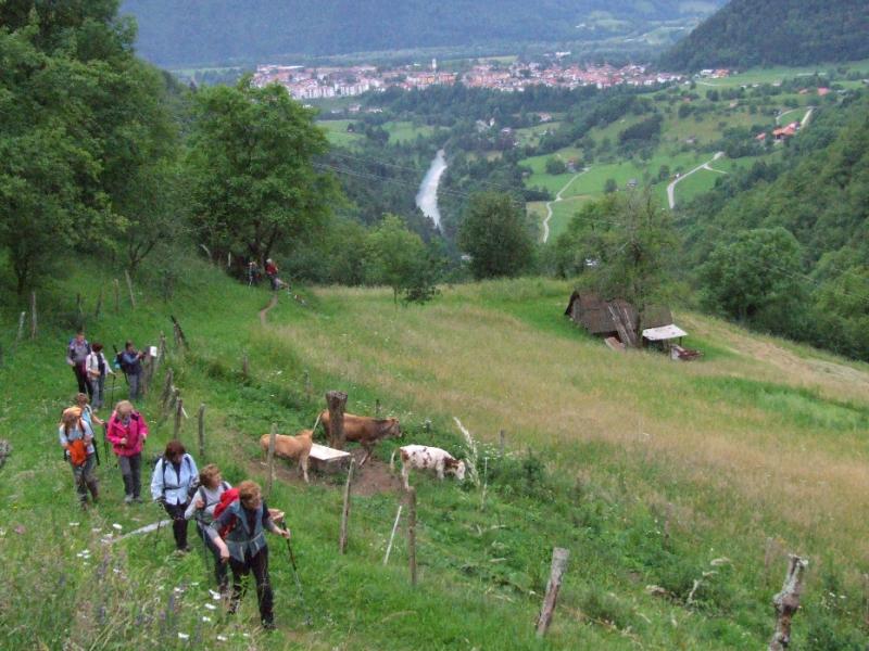 V Zatolminu, pri Tolminskih koritih, ki ležijo 180 m nad morjem in predstavljajo najnižjo točko Triglavskega narodnega parka (TNP), smo začeli naš pohod. Pot nas je vodila čez Hudičev most nad sotesko Tolminke mimo Dantejeve (Zadlaške) jame do zaselka na Lazu, kjer se čez cesto gledata razpokana hiša, ki še komaj stoji skupaj in obnovljeno domovanje z lepo urejeno okolico in prijaznimi domačini. Od tu se nam je odprl lep razgled na Tolminsko kotlino s Kozlovim robom na desni in iz 1. svetovne vojne znanimi Mengorami na levi.