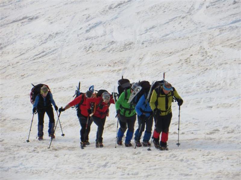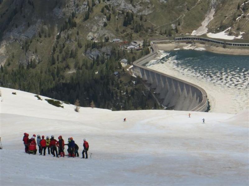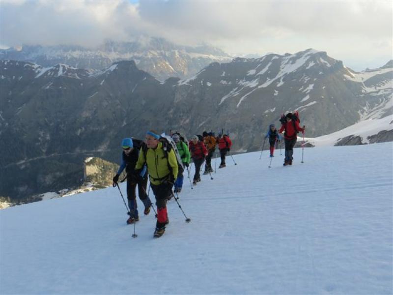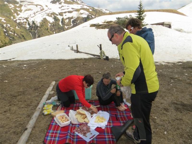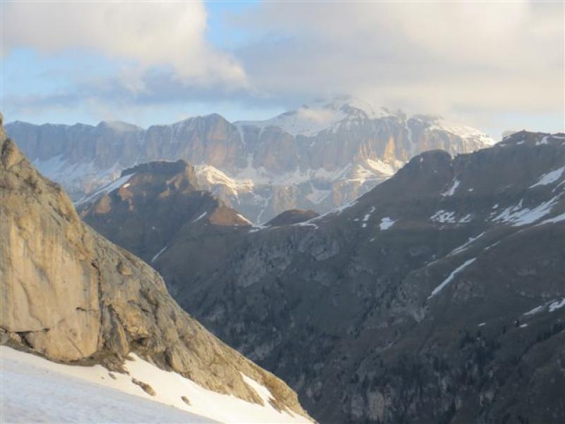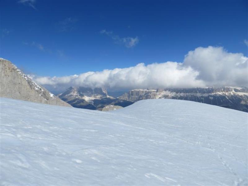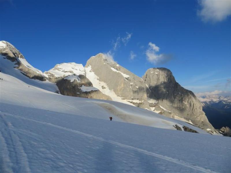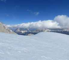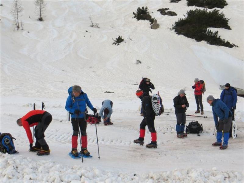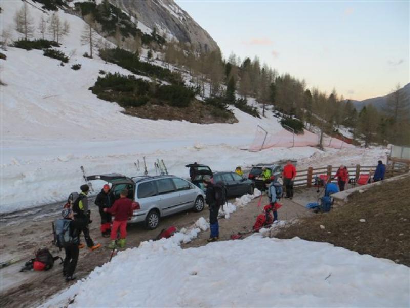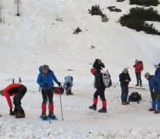 Zbrali smo se kot že vsako leto v zgodnjem jutru ob 2,00 uri na mejnem prehodu Vrtojba ob lepi polni luni, zvezdami in čisto jasnem nebu. Naložili smo vso potrebno zimsko opremo, smuči, krplje, dereze in še ostalo ter se podali na pot po AC do Portoguara in naprej do Beluna po dolini Kadore in naprej do našega izhodišča ob jezu pod panoramsko žičnico na Marmelado. Tja smo prispeli ob 5,15 uri se na hitro opremili in podali po lepo zasneženem smučišču. Razmere za hojo so bile zelo ugodne zato sem se odločil, da gremo na najvišji vrh Punta Penije 3343m. Razdelili smo se na dve skupini 6 turnih smučarje in 10 pohodnikov. Napredovali smo sprva kar hitro nato pa smo morali prečkati strmo plazišče in se je hoja nekoliko v hudi strmini upočasnila. Nismo se dali in smo nadaljevali kar korajžno saj smo že kmalu pod vrhom pridružili še eni skupini naših prijateljev turnih smučarjev. Po štirih urah vzpona smo dosegli naš vrh Marmolade kateri je bil za kratek čas ovit v meglo a se nam je tudi pokazal sonček, da smo se lahko poslikali in si na hitro pogledali nižje vrhove Dolomitov kot najbližji Picbue v daljavi Tofane in Monte Kristalo pa še druge lepe vrhove ki jih ne manjka v Dolomitih. Temperature na vrhu so bile zelo ugodne okrog ničle. Po mali malici smo se začeli kar hitro spuščati v dolino in kar v treh urah smo se spet vrnili na naše izhodišče na katerem so nam naši turni smučarji, ker so bili hitrejši pripravili pravi piknik z domačimi salami in raznimi drugimi jedmi. Skratka tudi tale izlet je bil enkraten in še ga bomo ponovili.