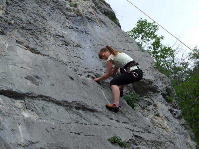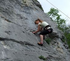 Iz Gregorjevega avta smo izvlekli vrvi, vponke, plezalne copate in se odpravili v smeri cerkvice sv. Nikolaja poiskat za naše izkušnje primerna plezalna mesta. Gregor in Staša, že preverjena plezalca, sta šla v izbrane plezalne smeri prva, da sta v obroče na vrhu vpela varovalne vrvi. Pokazala sta nam, kako pripnemo varovalno vrv na plezalni pas, kako se uporablja različne varovalne pripomočke. Potem se je začelo spoznavanje s skalo, iskanje oprimkov in opor, pridobivanje zaupanja v tistega, ki te varuje. Na koncu veselje ob zaključku smeri in spust s pomočjo vrvi na izhodišče. Dan smo zaključili zadovoljni z dosežki, tudi Milena, ki je premagala svoj strah, v Vipavi ob sladoledu.