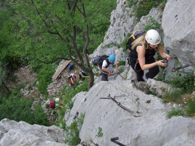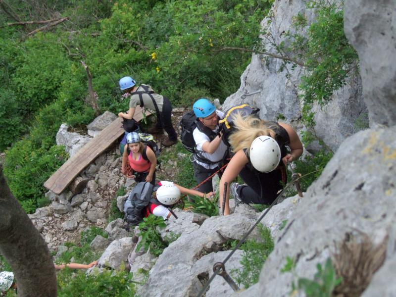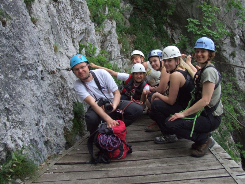 V oblačnem jutru smo si opasali plezalne pasove, nanje pripeli samovarovalne komplete in se (razen gostje Milene iz Bolgarije, ki jo je obvladal strah) podali po Furlanovi poti v skalo in na kline, pripeti na jeklenice. Sredi vzpona smo se z razgledne ploščadi ozrli po Vipavski dolini, potem pa brez posebnih težav izplezali na vrh. V dolino smo se vrnili po lažji poti, brez plezanja.