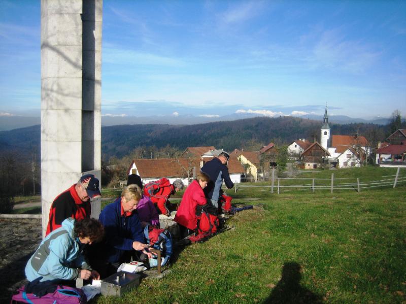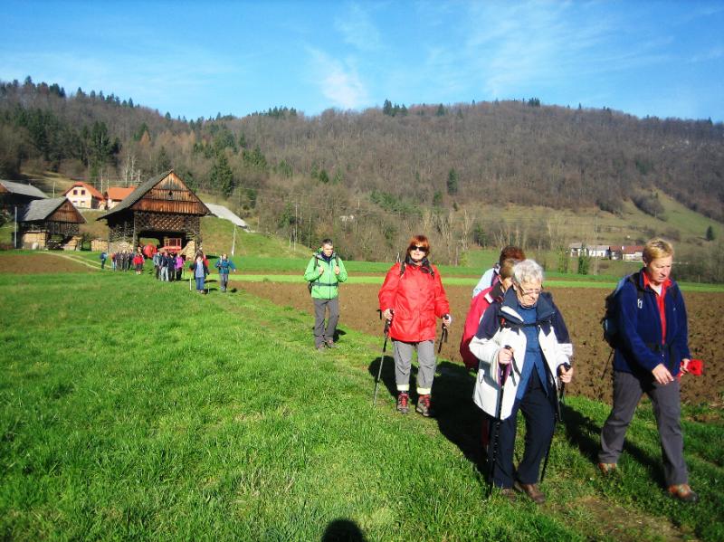 Pot smo nadaljevali po nekdanji rimski cesti. Po nekaj minutnem pohodu in prečenju gozda, smo se znašli na široki in utrjeni poti v smeri proti Mali Ilovi Gori. Med potjo smo imeli krasen razgled na Raduho in Olševo. Malo pred naseljem se je razgled odprl vse do Triglava. Po kratkem postanku smo nadaljevali proti Veliki Ilovi Gori, kjer smo se ustavili pri spomeniku padlim partizanom v 2. svetovni vojni. Večina si je odtisnila štampiljko Grosupeljske planinske poti, naredili smo nekaj posnetkov s soncem obsijanih in zasneženih gora v daljavi ter nadaljevali po Poti Kurirjev in vezistov NOV Slovenije. Kmalu smo bili v Ravnem dolu, kjer smo odtisnili še eno štampiljko, tokrat TV št. 55.