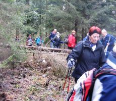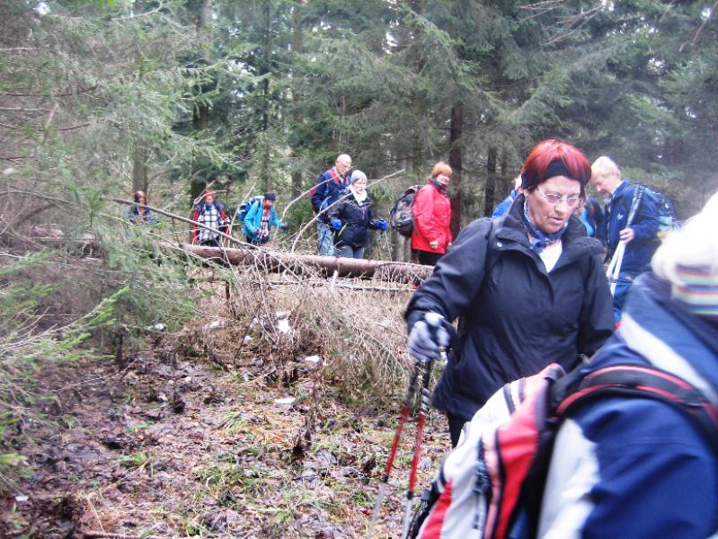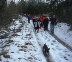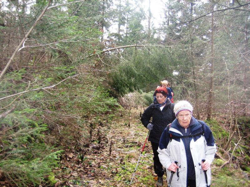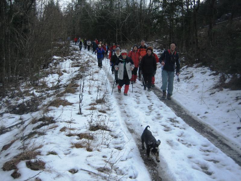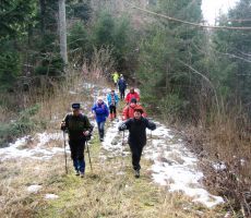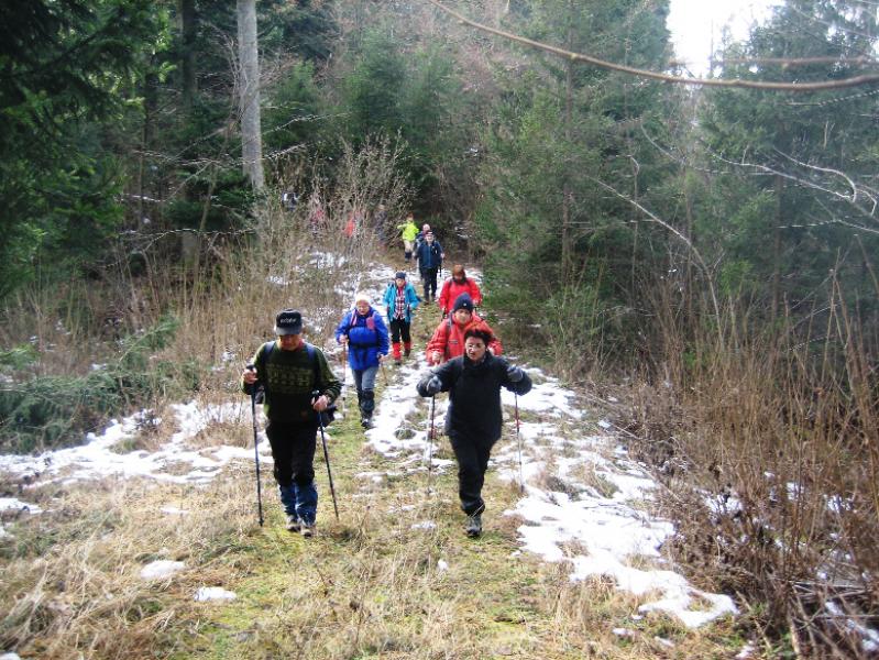 Sčasoma se je široka pot spremenila v ozko pešpot. Tukaj smo naleteli na manjše zaplate snega in tudi tla so bila poledenela. Večkrat smo morali tudi preko podrtih debel, ki so ležala na poti. Toda dan je postal sončen in je bolj spominjal na pomlad kot na zimo. Tudi veter se je umiril in hoja je bila resnično prijetna. Hojo skozi gozd smo zaključili na utrjeni makadamski cesti, ki nas je pripeljal do izvoza avtoceste za Logatec. Kratek spust do industrijske cone ter vkrcanje na avtobus in že smo bili na poti proti Hotedršici, kjer nas je čakala malica. Ob odhodu iz gostilne Turk je večina zadovoljno ugotavljal, da je njen dober glas povsem upravičen. Še slovo od lokalnega markacista in že smo drveli proti domu. Za nami je bil še en lep dan, poln prijetnega druženja.