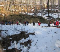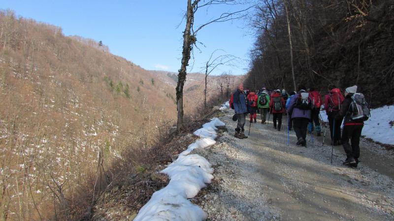 Po ogledu smo se vrnili na gozdno cesto in nadaljevali pohod po dolgem gozdnem grebenu, s katerega smo imeli lep pogled na bližnje in daljnje vaške zaselke. Z grebena smo v 35 minutah sestopili po kolovozu do Planinskega doma, ki pa je bil na našo žalost zaprt. Pot smo nadaljevali do Pridne vasi, kjer nas je čakal naš zvesti avtobus LPP.